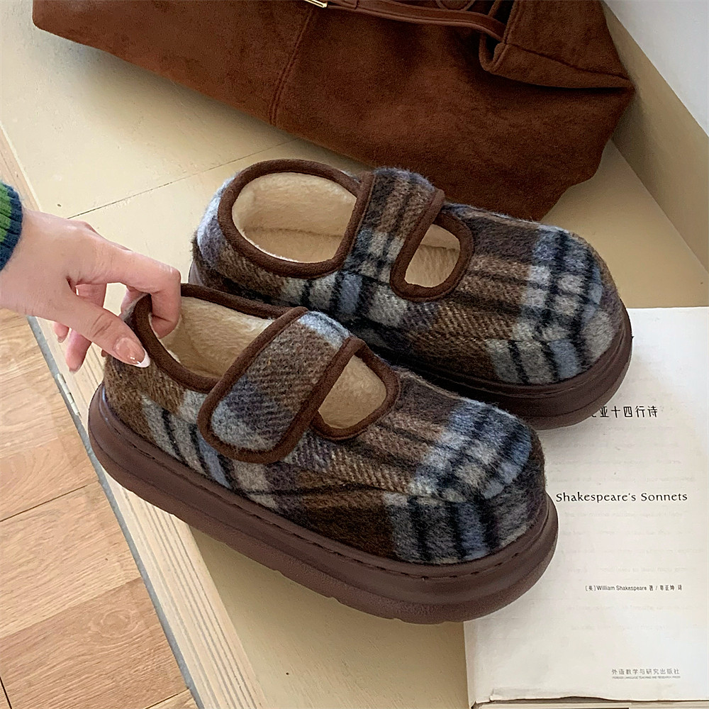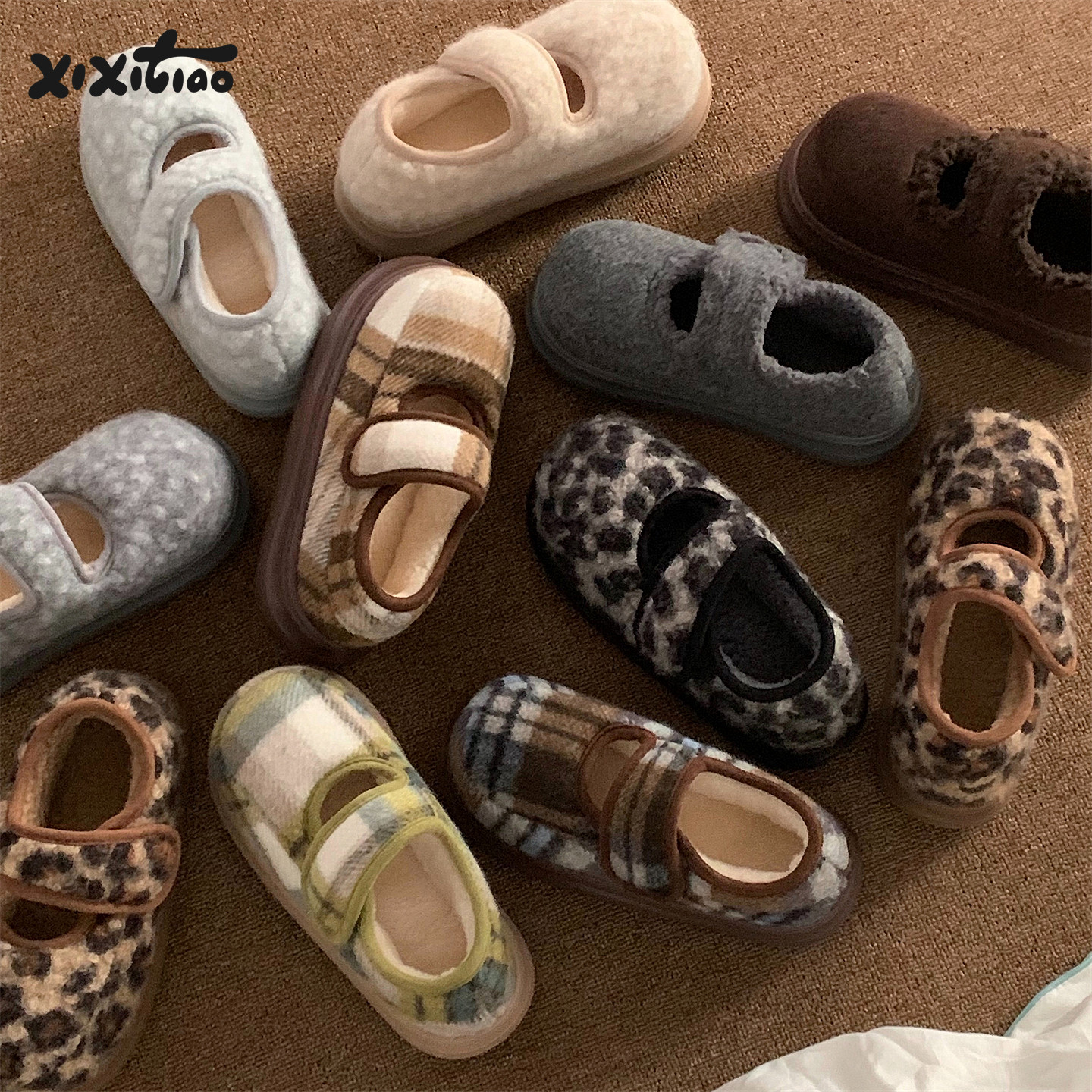 细细条 时尚豹纹玛丽珍面包棉鞋女休闲秋冬防滑厚底魔术贴豆豆鞋