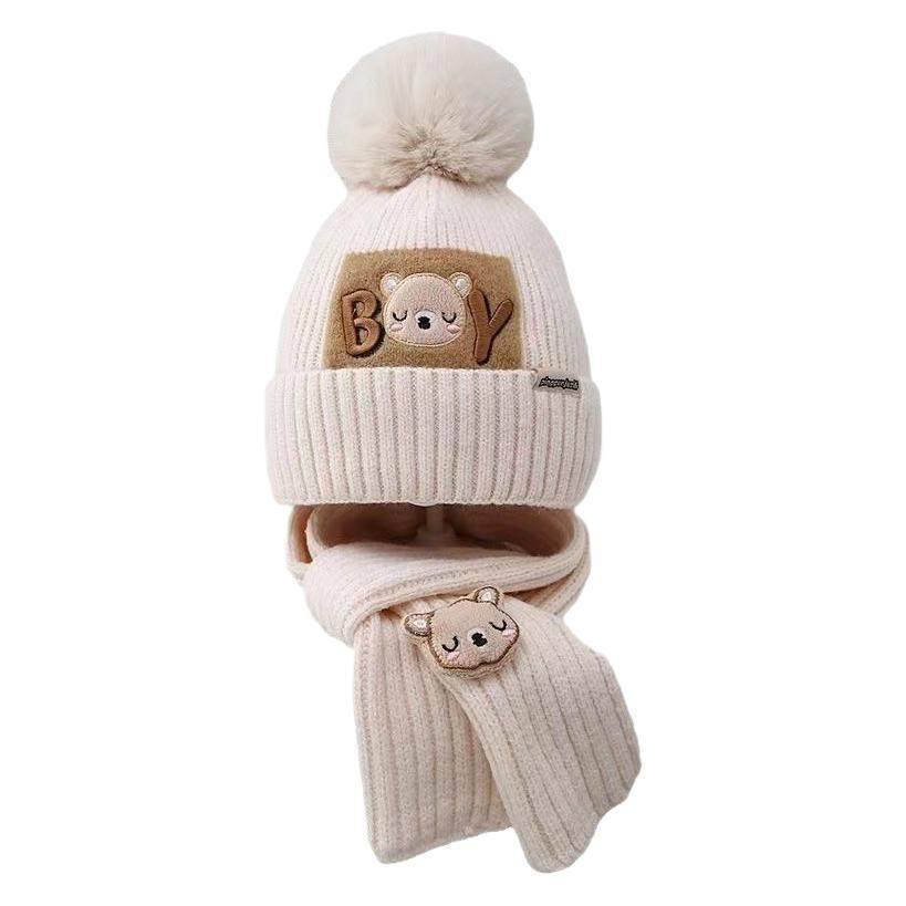秋冬儿童帽子男孩小熊毛线帽女童针织加棉保暖宝宝帽子围巾两件套