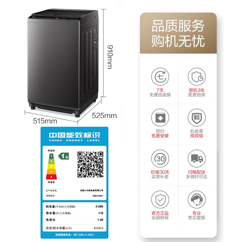 小天鹅洗衣机全自动智能洗脱租房宿舍家用8KG变频大容量波轮28