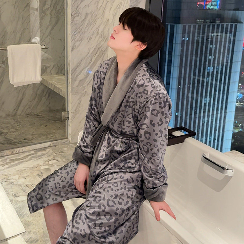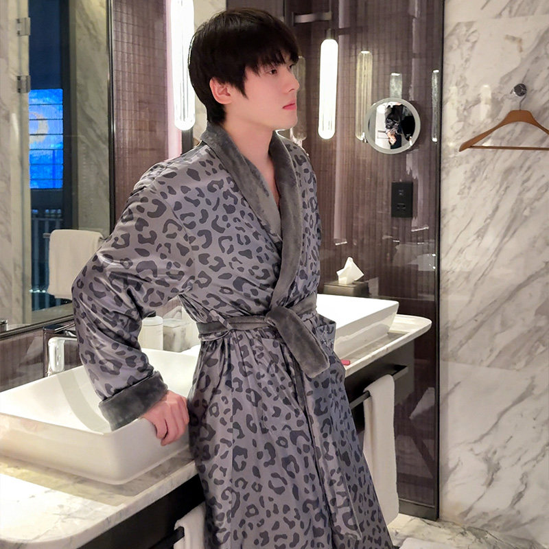 秋冬季睡袍男士加厚加绒珊瑚绒睡衣保暖颗粒绒加长款浴袍简约大码