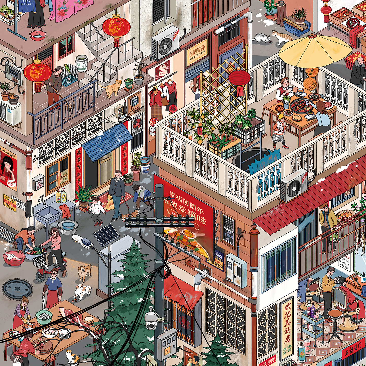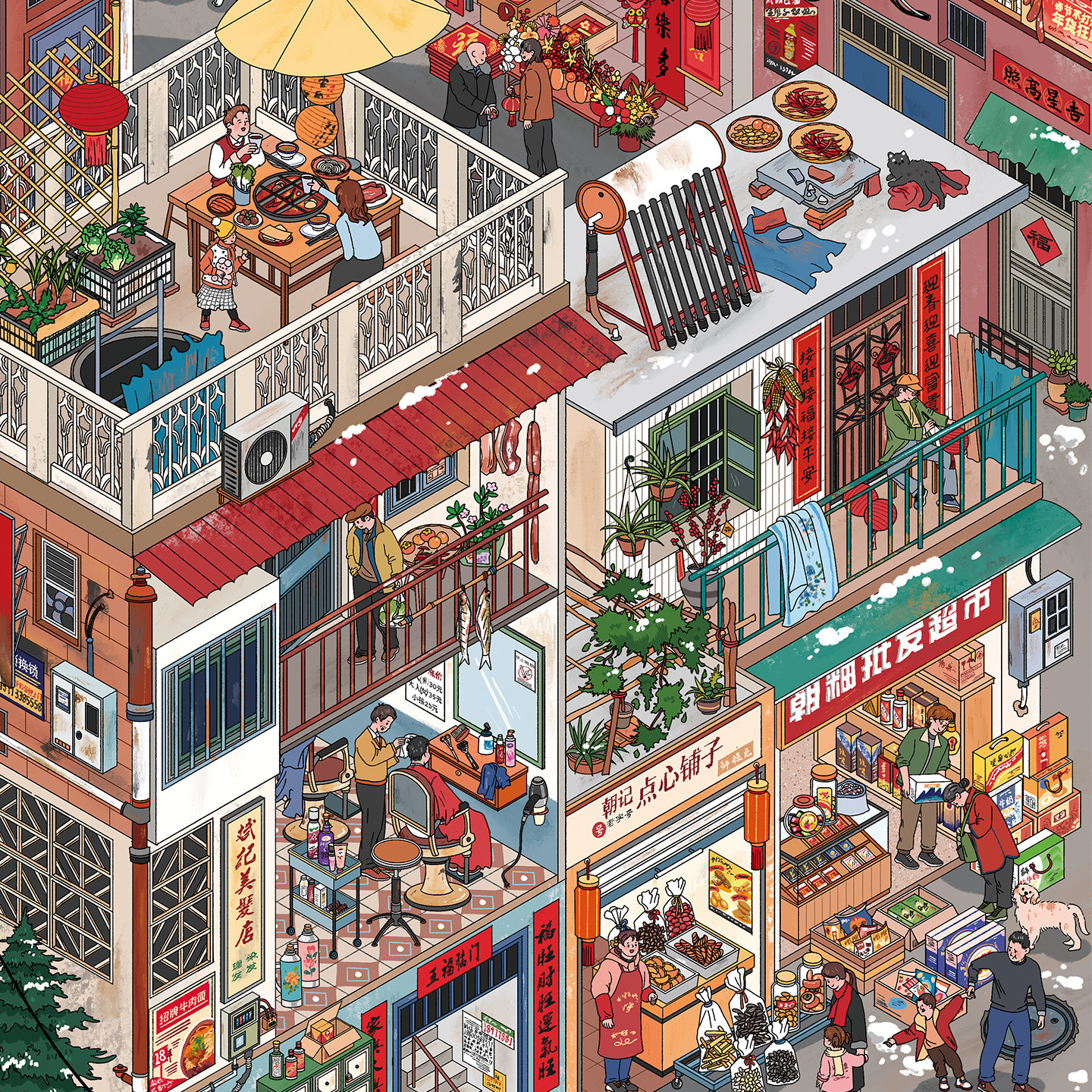 小城新年造景贴纸朝釉特油7.0一牙西瓜子画风新年节日系列特油亮膜微缩场景3D立体小屋贴画手帐手工玩具女孩