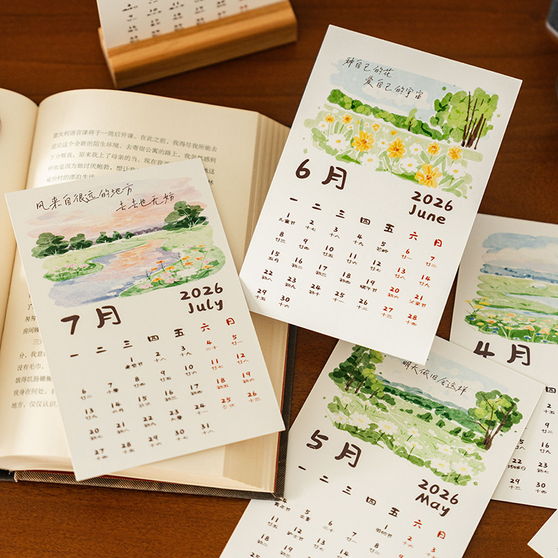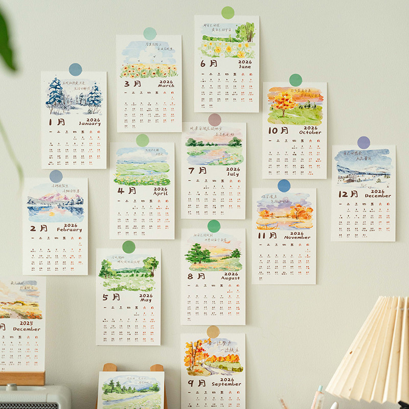 2026新款小清新油画风景日历卡片墙贴家居装饰台历桌面摆件月历