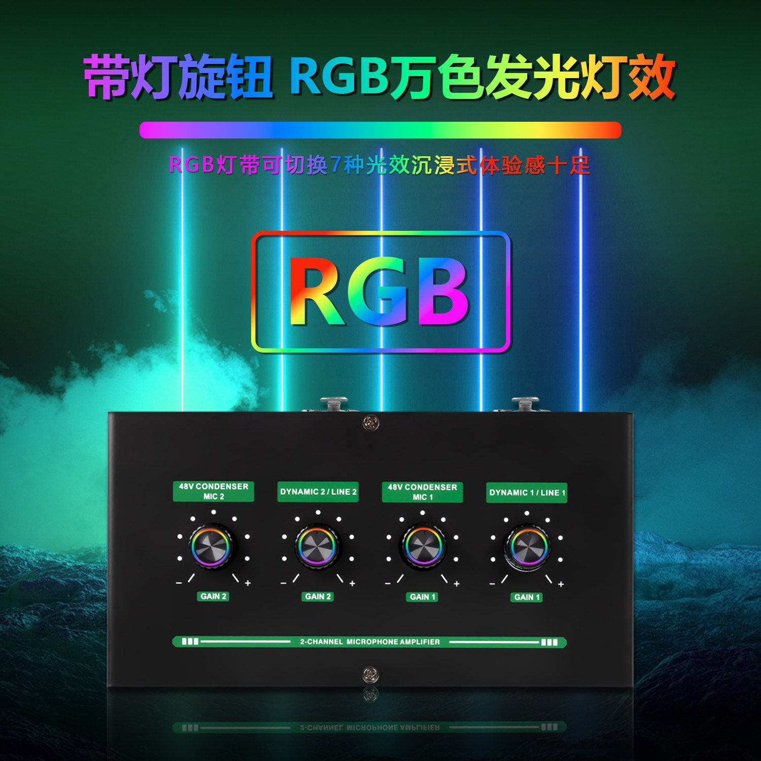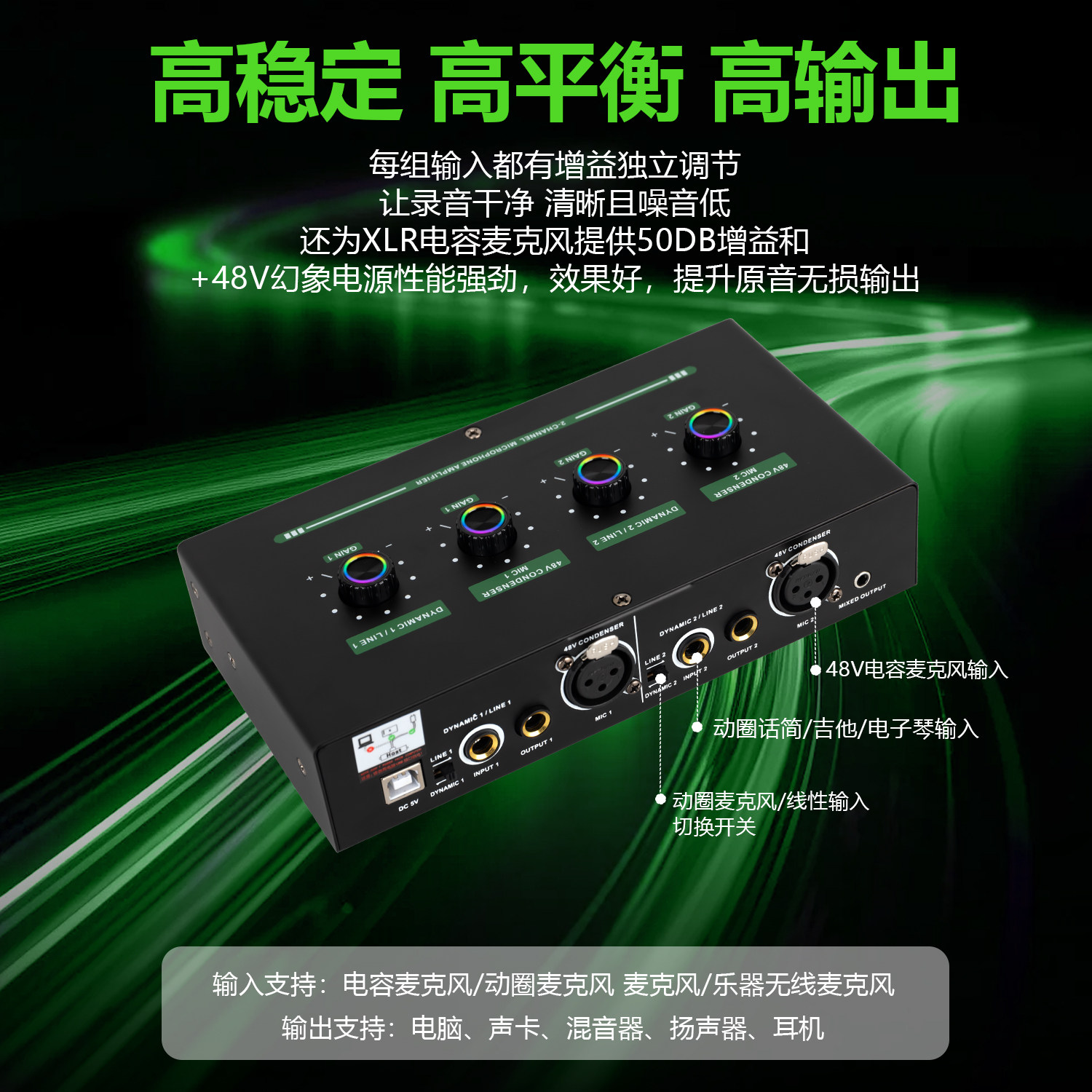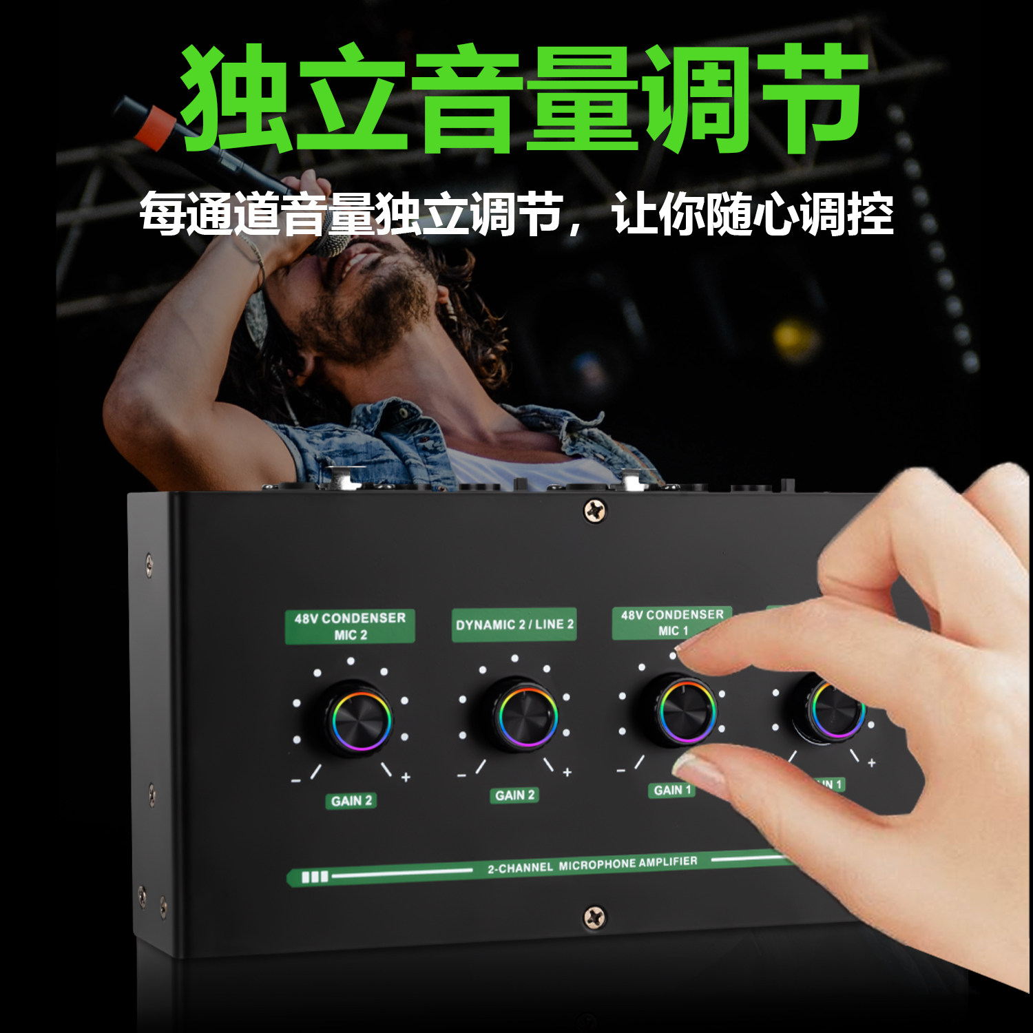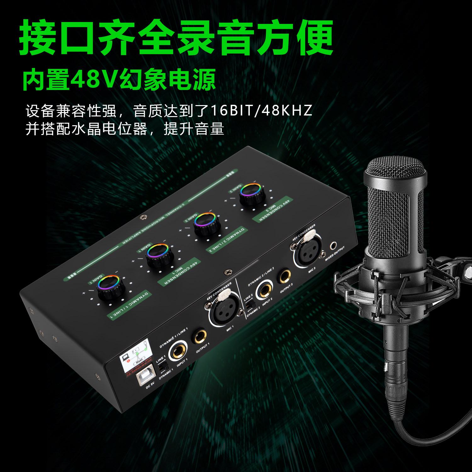 麦克风放大器带混响动圈电容话筒乐器声卡通用48V幻象电源2路话放