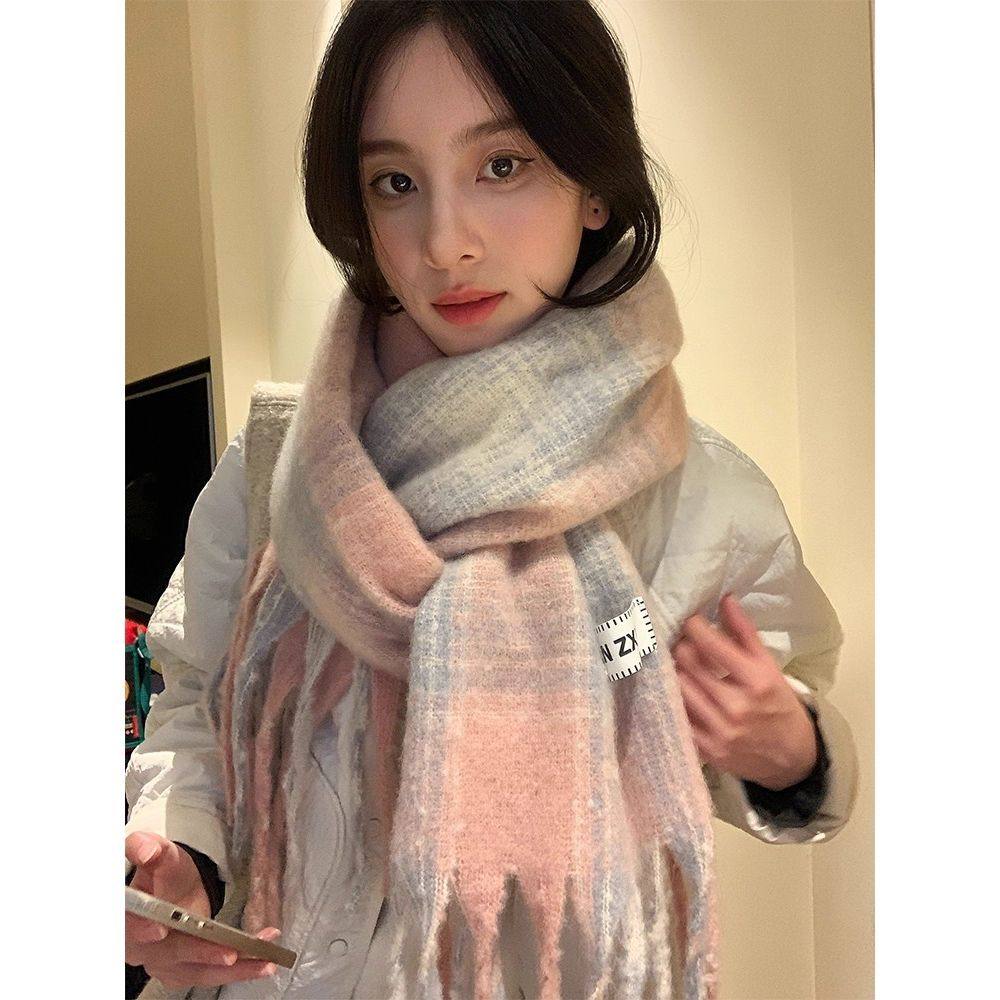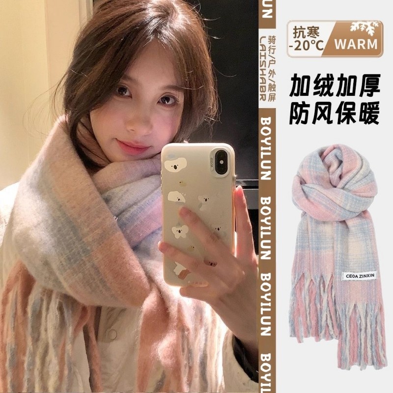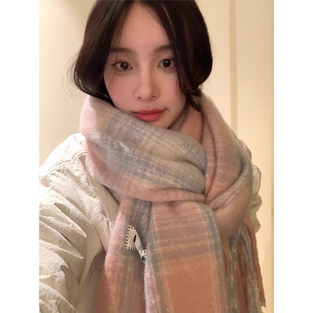 韩系粉色格子围巾女冬季2025新款保暖披肩学生氛围感护颈流苏围脖