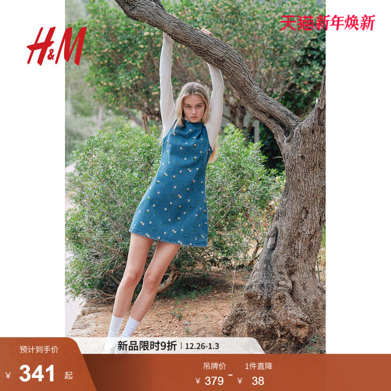 HM女装连衣裙2025冬季新款牛仔刺绣露背短款设计感碎花裙1282227