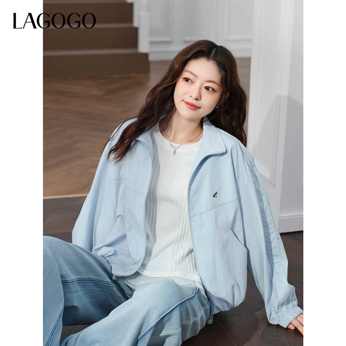 LAGOGO立领绣花夹克女拉谷谷2026春新款百搭冰川蓝休闲外套