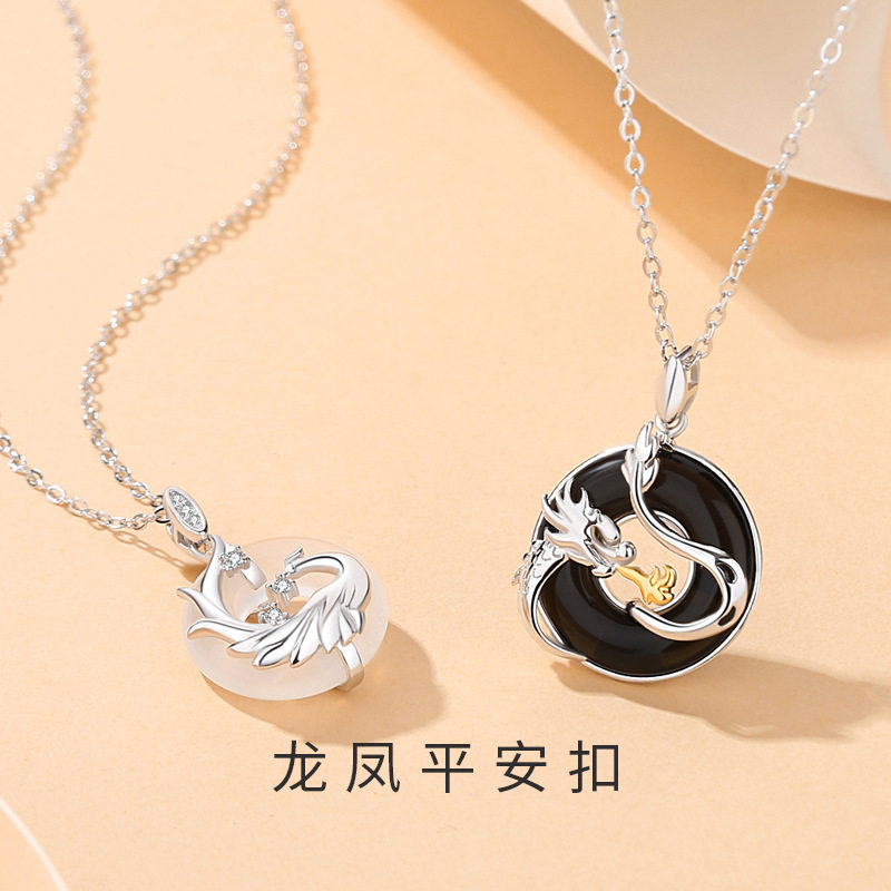 国潮纯银龙凤平安扣情侣项链男女原创生肖龙黑玛瑙吊坠锁骨链首饰