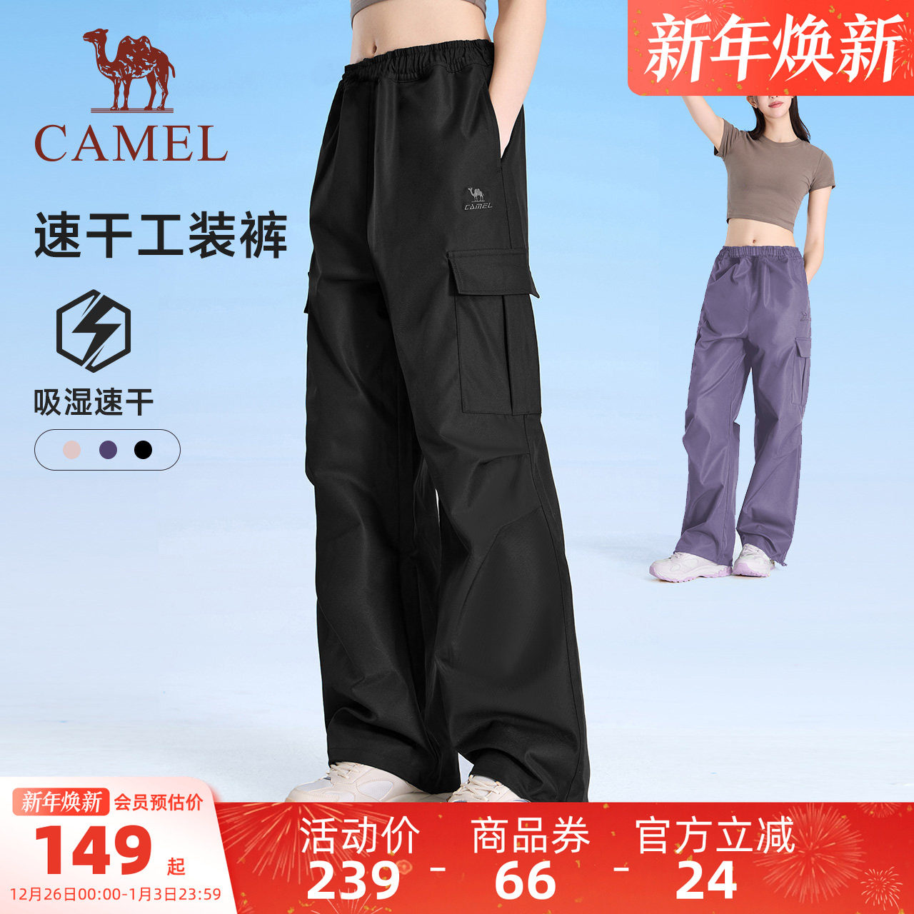 骆驼运动工装裤女冬季加绒直筒伞兵户外防泼水防风徒步登山裤男