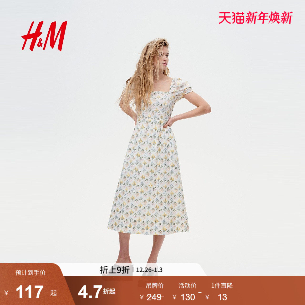 HM女装花卉连衣裙2025年冬季新款法式泡泡袖植物印花长裙1275443