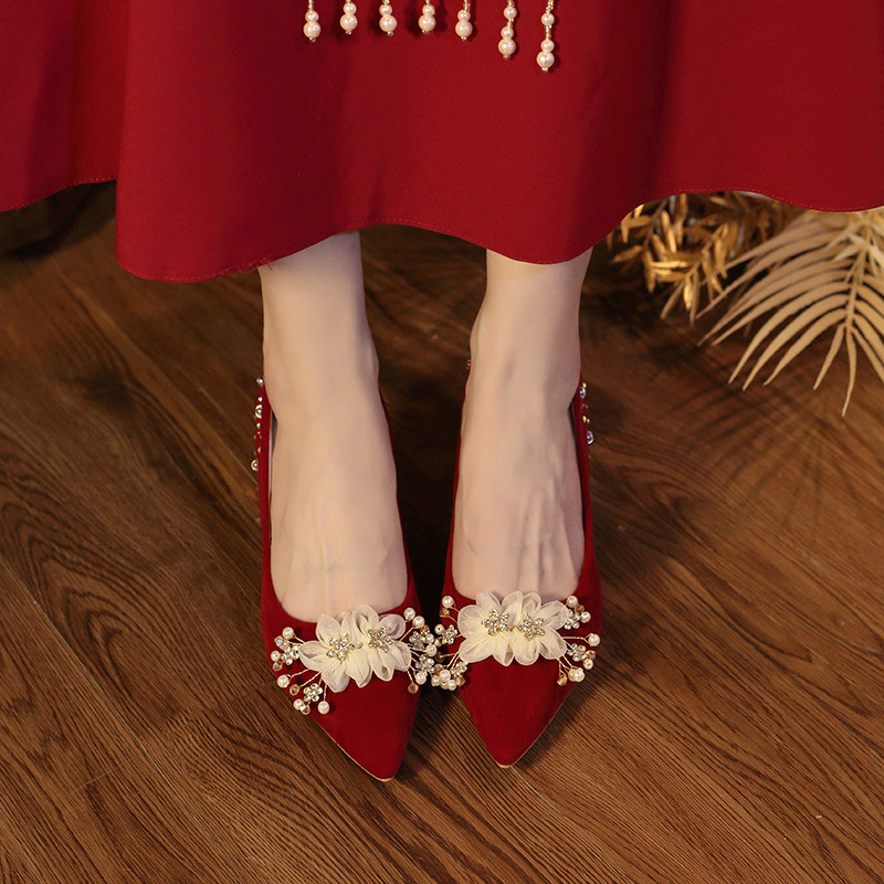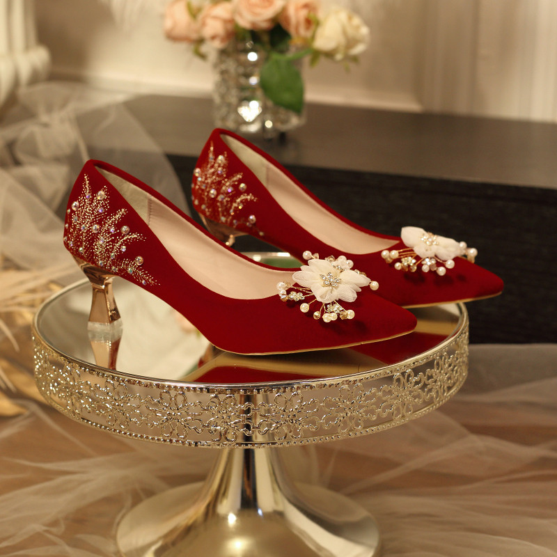 绝美婚鞋女2025新款中式秀禾服婚纱两穿新娘鞋孕妇红色订婚高跟鞋
