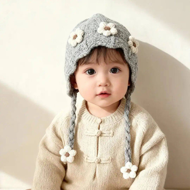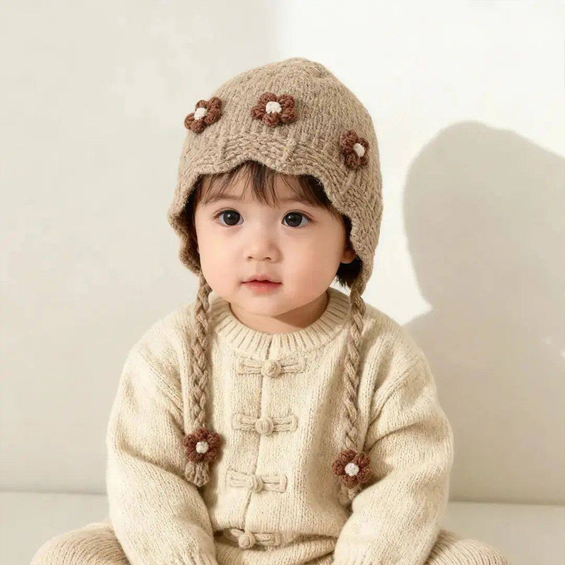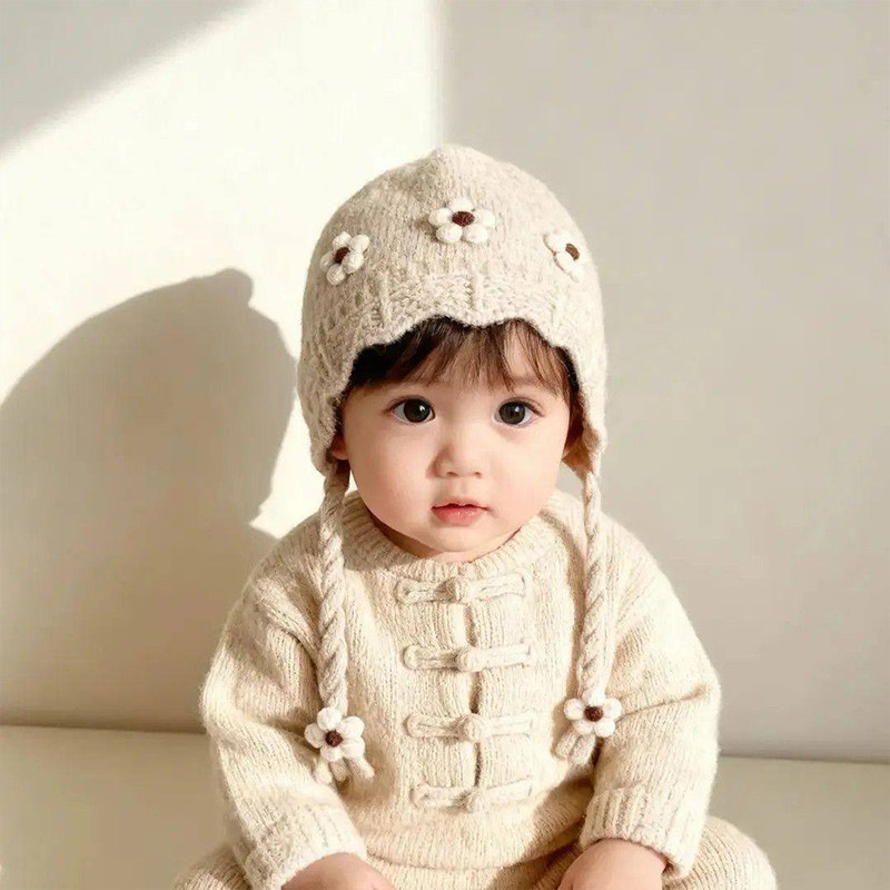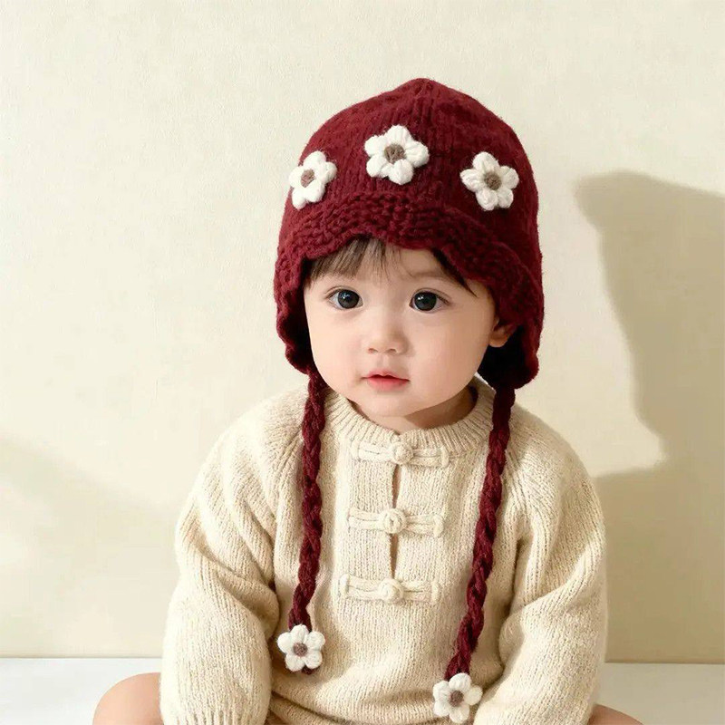 宝宝红色帽子秋冬季保暖加厚针织护耳帽女儿童防风毛线新年系带帽