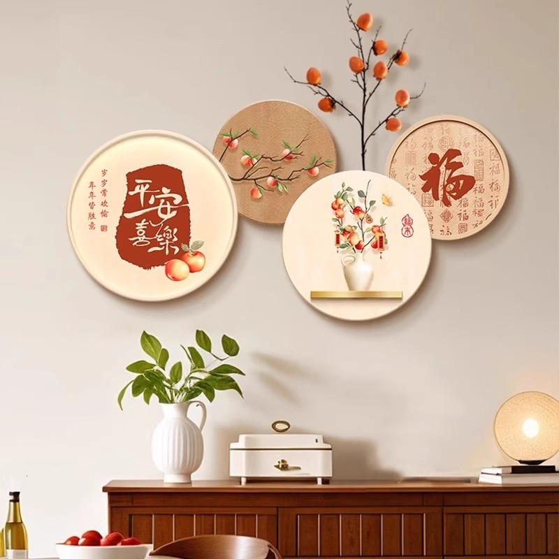 新中式餐厅装饰画饭厅墙面壁画客厅沙发背景墙挂画圆形柿柿如意画