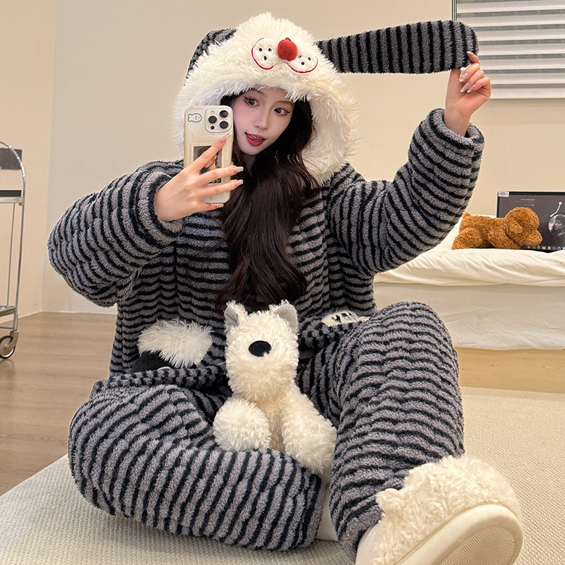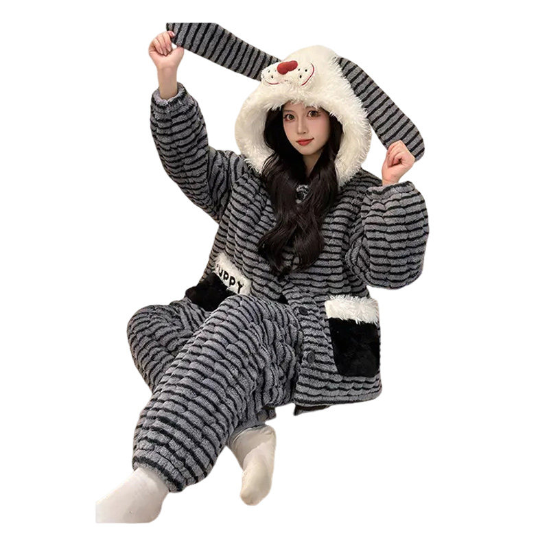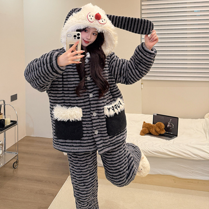 暖呼呼睡衣女冬季珊瑚绒三层夹棉加厚加绒可爱新款条纹冬天家居服