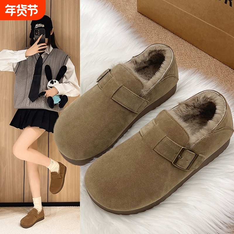 加绒全包勃肯鞋女春秋季2025新款一脚蹬豆豆单鞋毛毛鞋雪地靴防滑