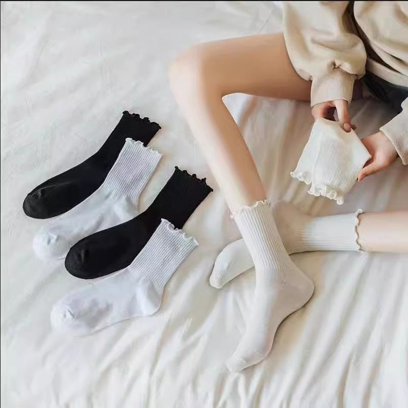 木耳边薄款袜子女夏季白色花边堆堆袜搭配小皮鞋乐福鞋黑色中筒袜