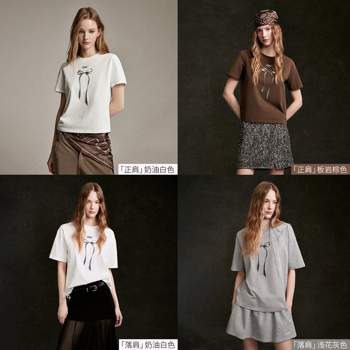 ONLY2026春季新款纯棉甜美立体重工刺绣蝴蝶结印花正肩短款T恤女