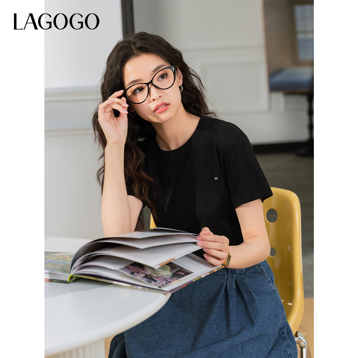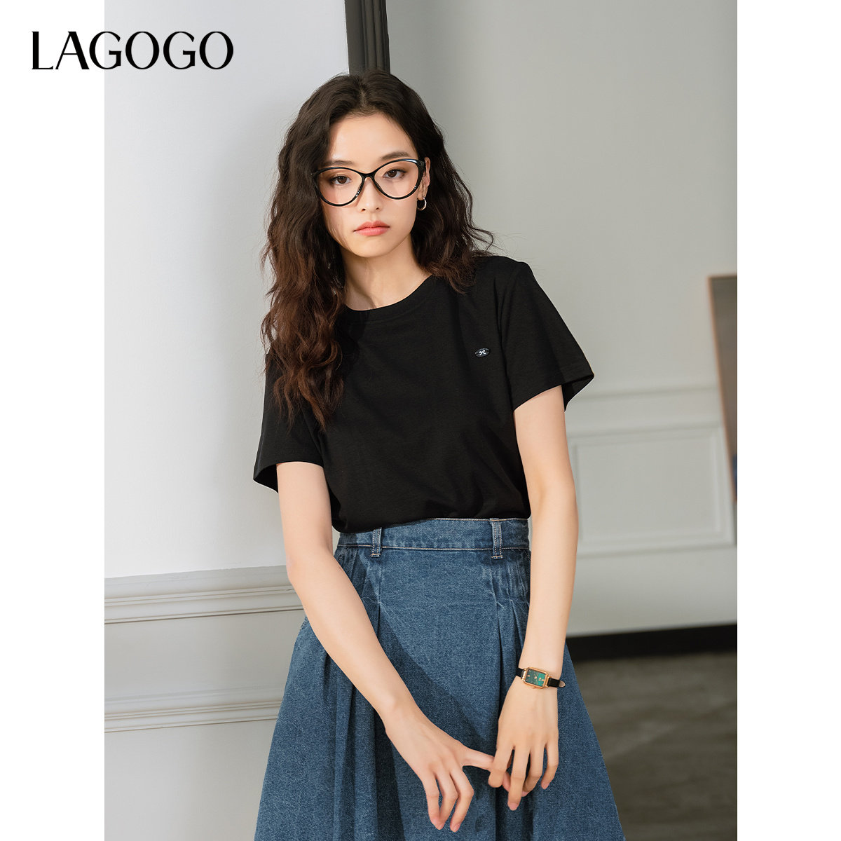 【莱赛尔】LAGOGO圆领舒适T恤女拉谷谷2025春夏新款简约黑色短袖