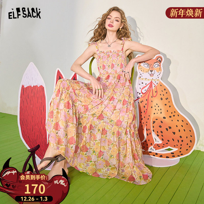 妖精的口袋蝴蝶结系带碎花吊带连衣裙女2025年夏季新款度假风裙子