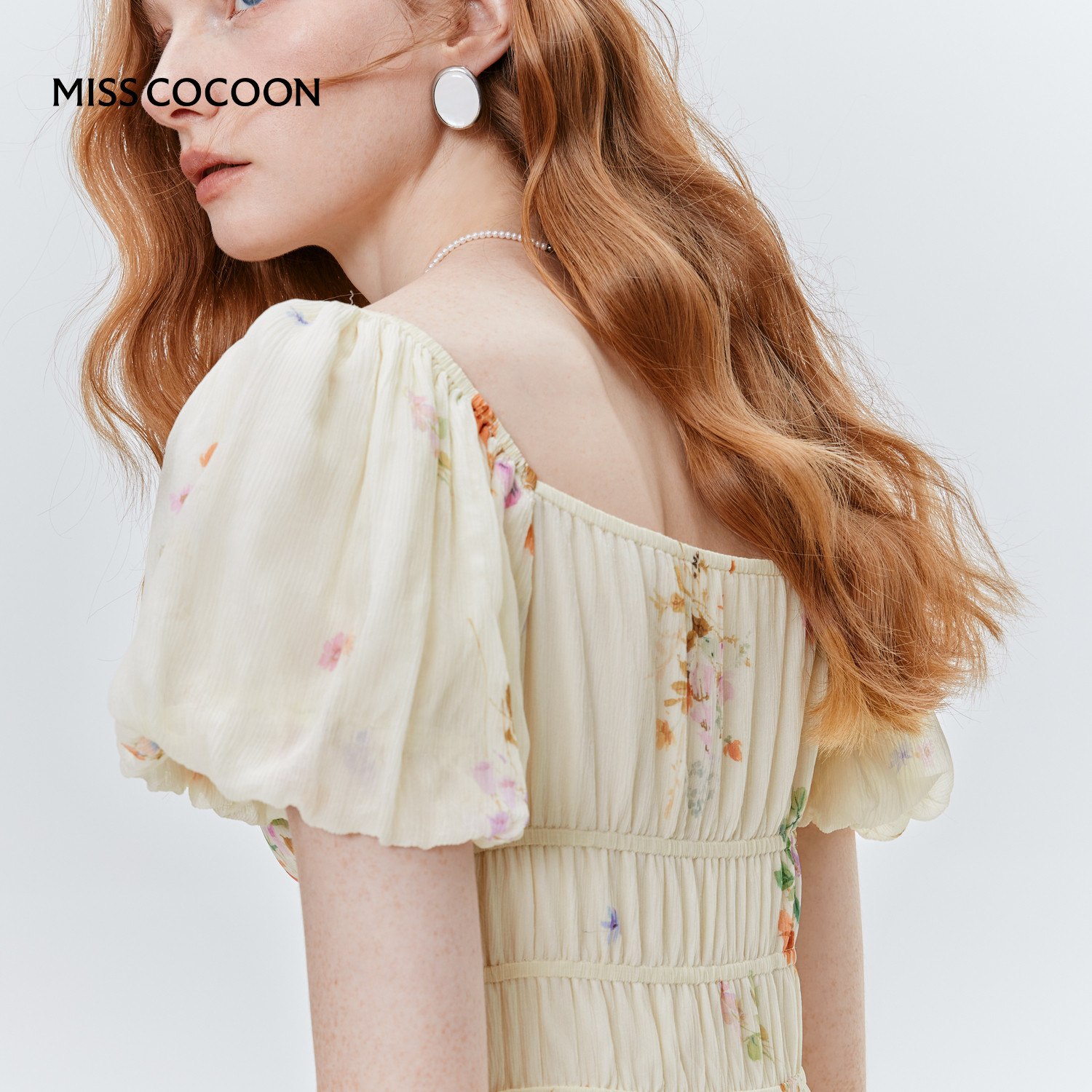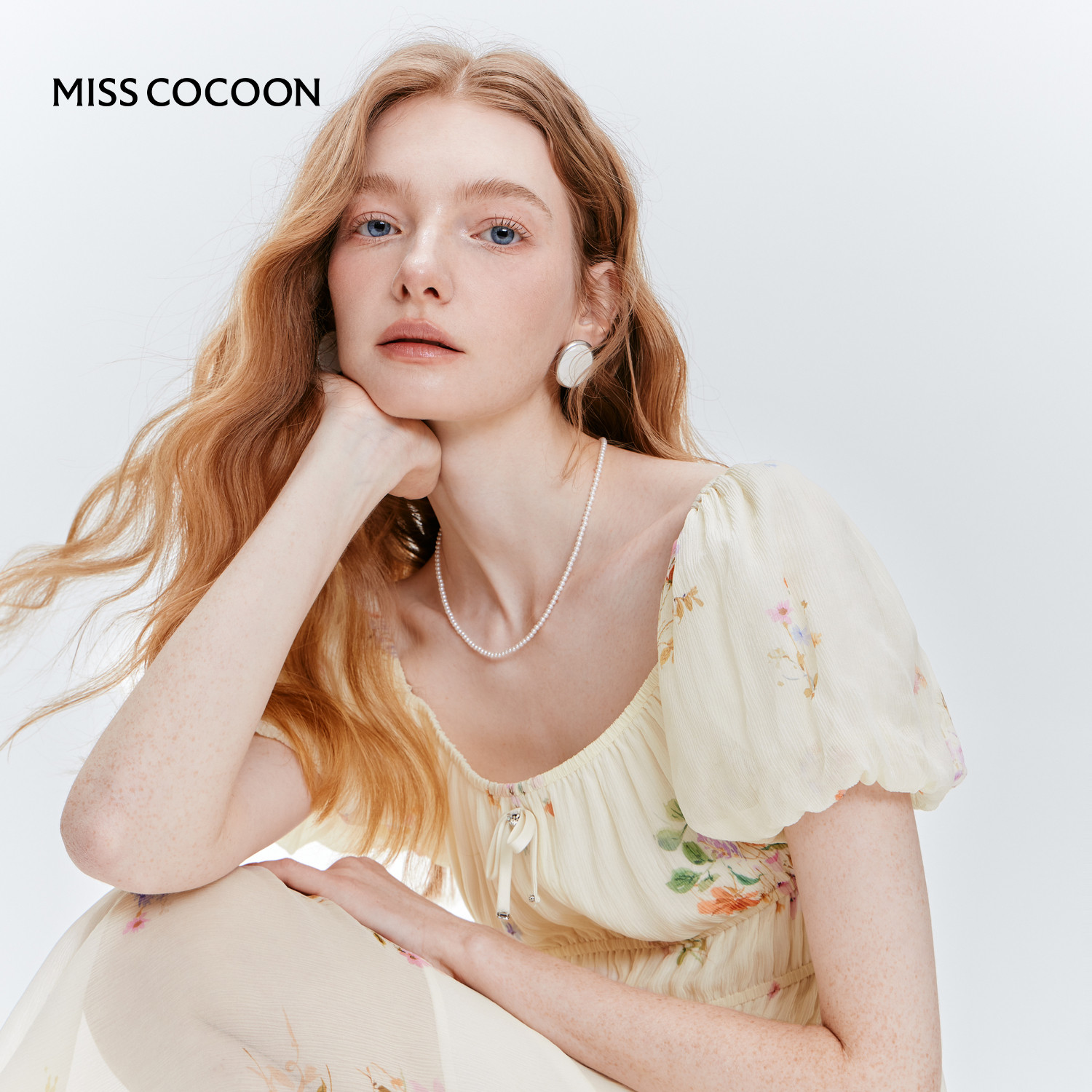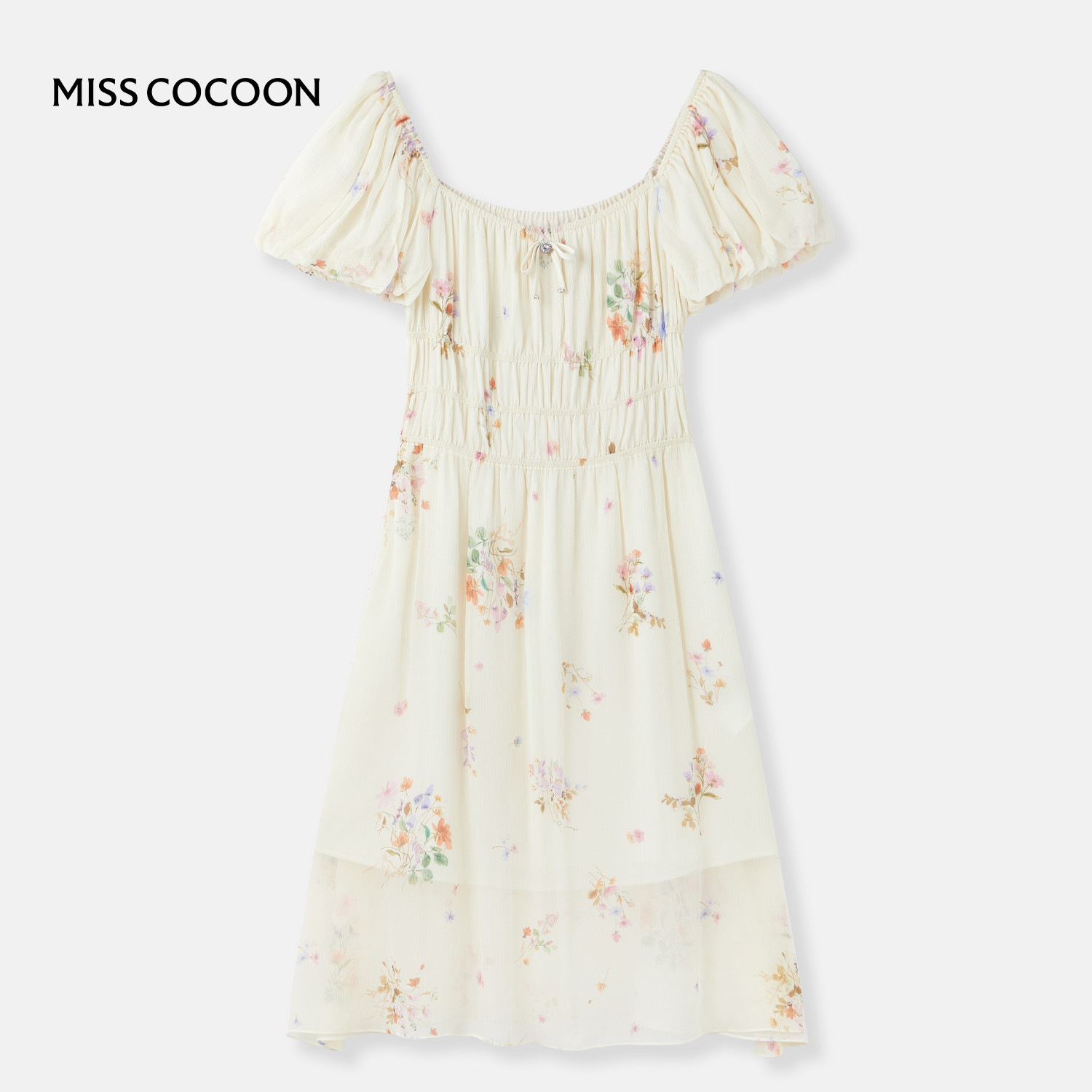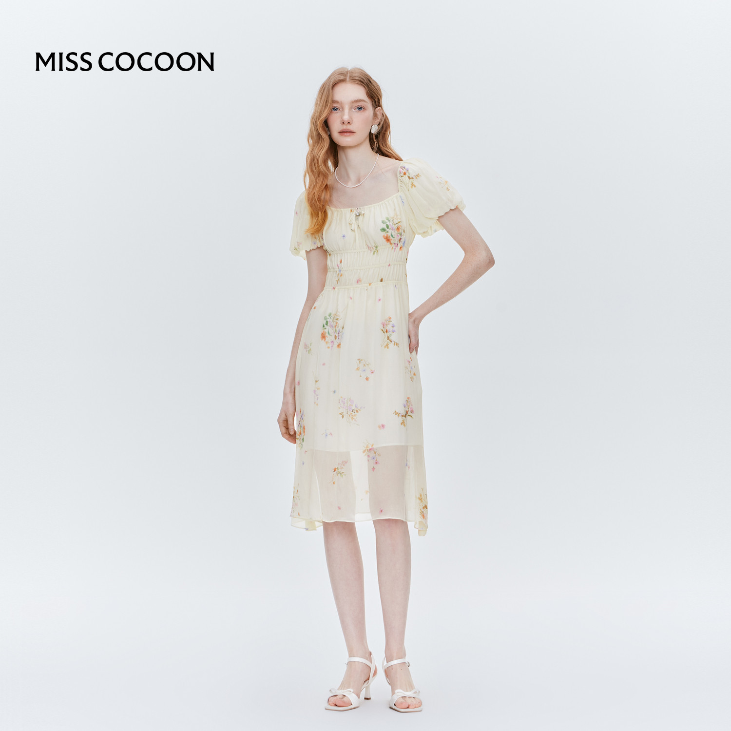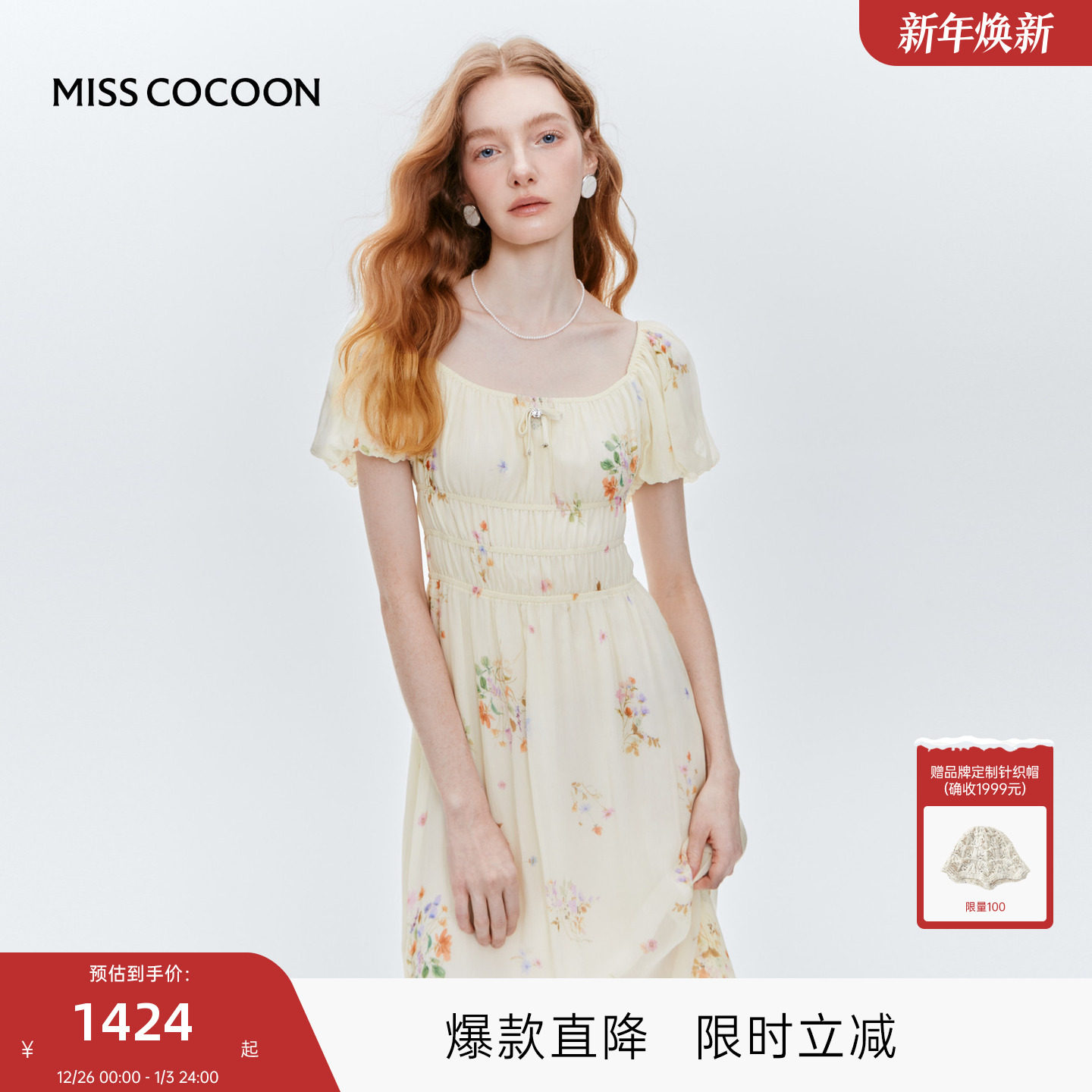 MISS COCOON可可尼桑蚕丝印花度假连衣裙女25秋季新款泡泡袖裙子
