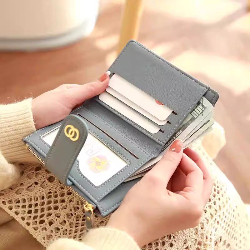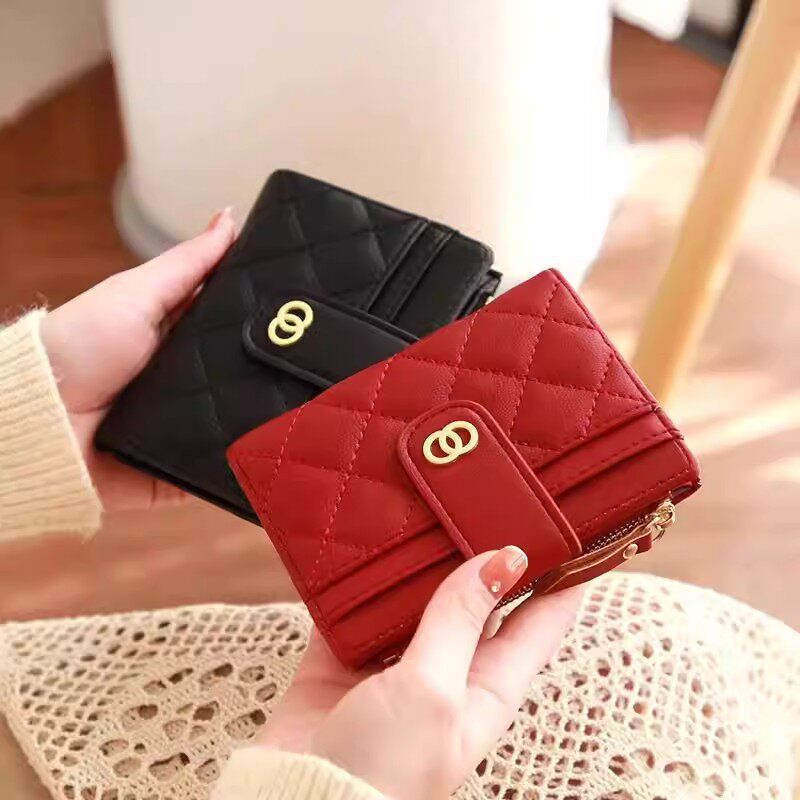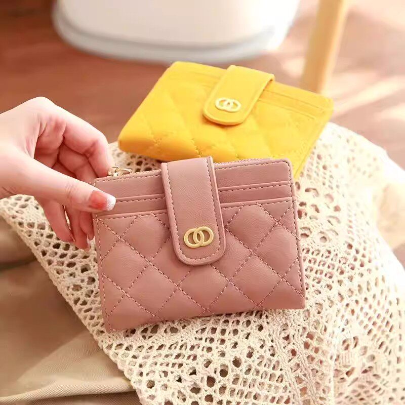 简约高颜值女士短款小钱包新款多功能轻薄菱格拉链搭扣零钱包卡包