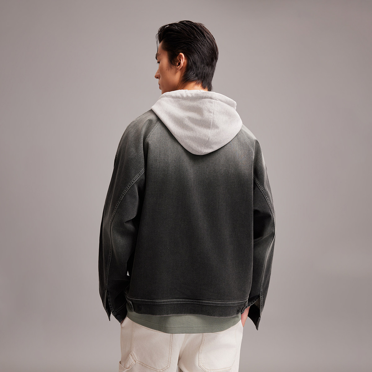 宽松版型,可拆卸连帽设计,衣身水洗设计