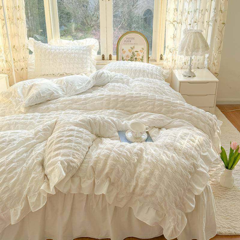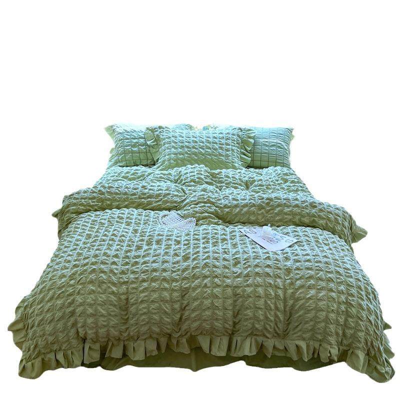公主风泡泡纱提花四件套床裙床上用品被套纯色花边水洗棉三件套