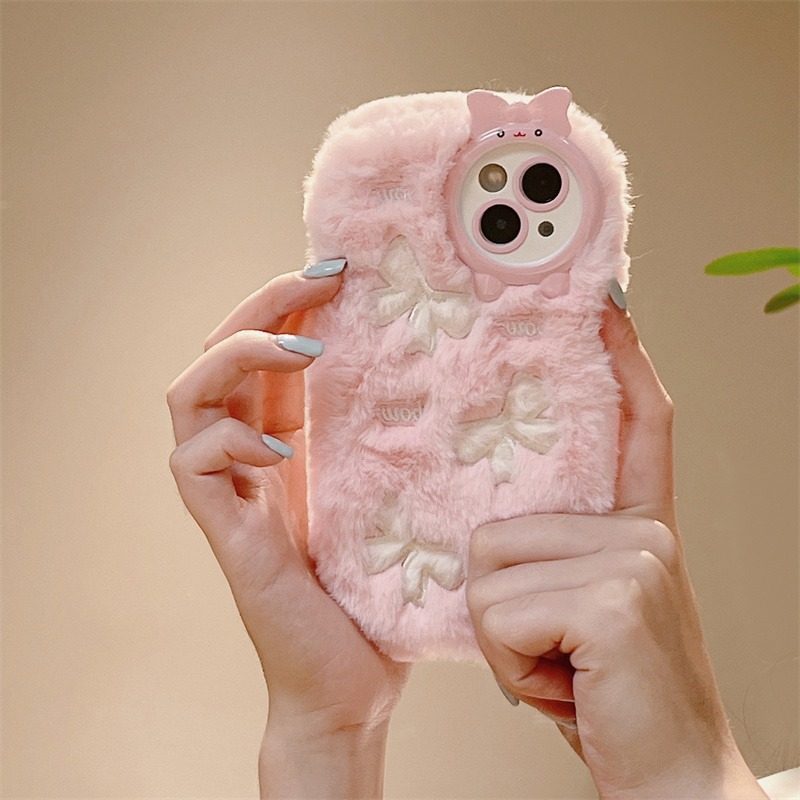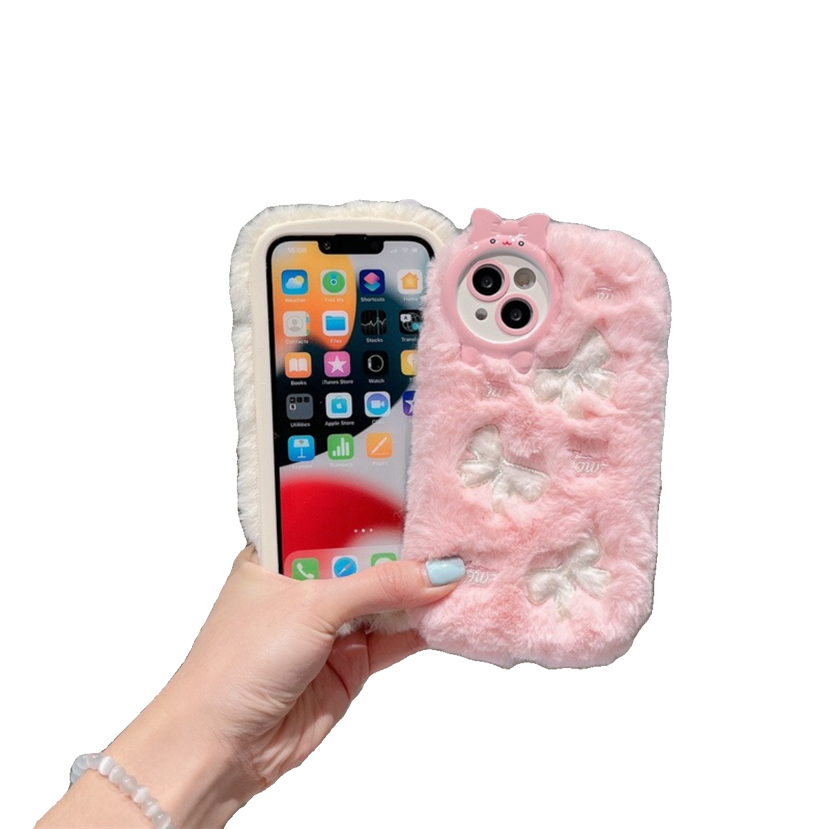 秋冬毛绒刺绣蝴蝶结适用苹果15promax手机壳iphone14新款13毛茸茸12高级感小众ins防摔全包创意16P白色个性11