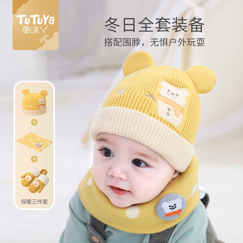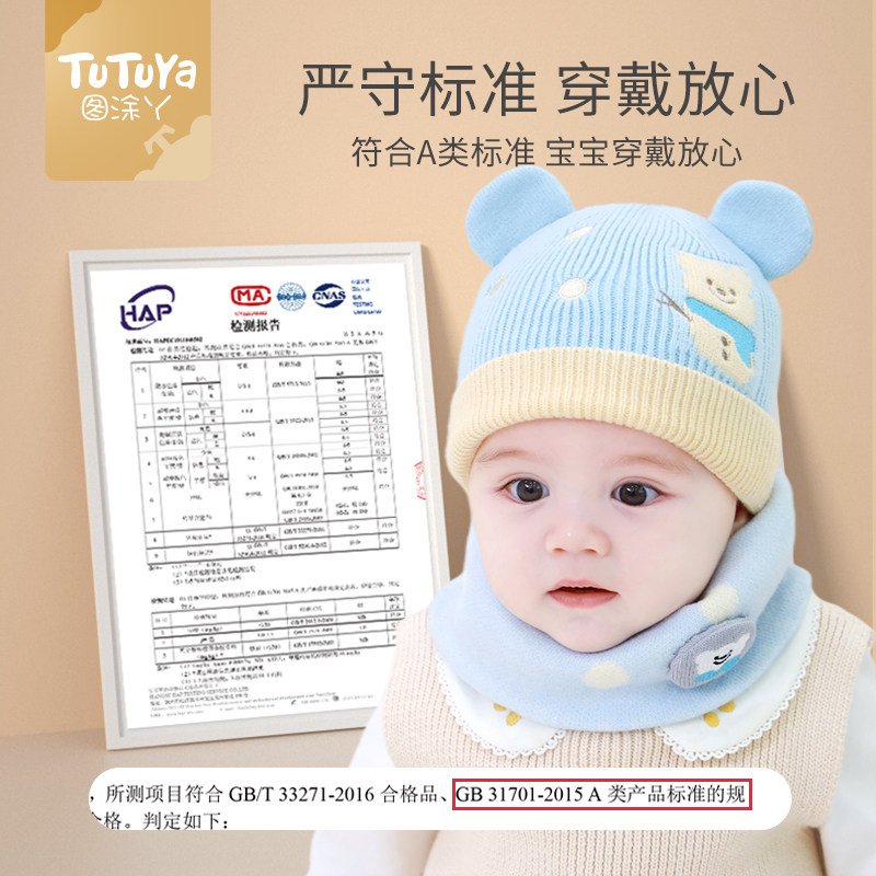 尼多熊婴儿帽子秋围脖一体宝宝毛绒帽防风护耳帽冬季保暖婴幼儿帽