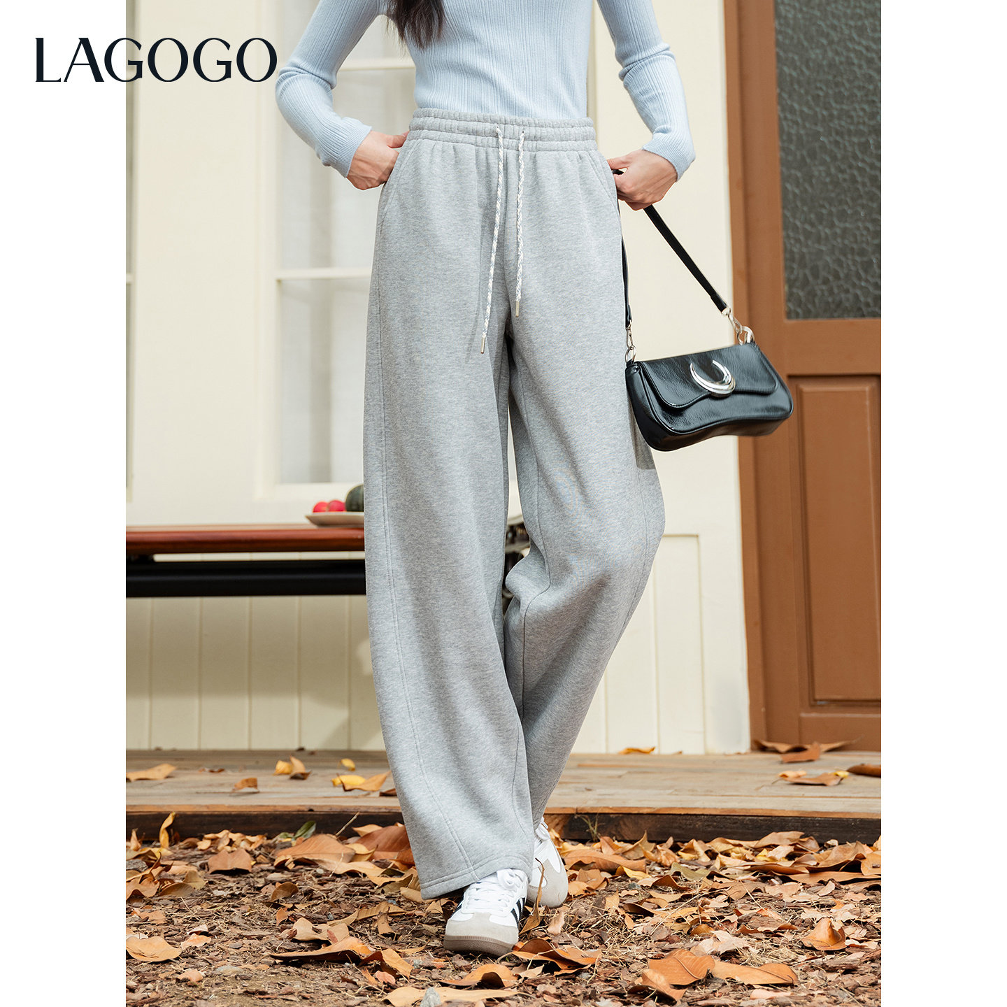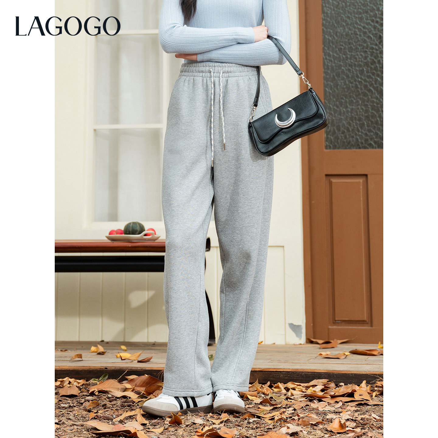LAGOGO浅灰抽绳弯刀加绒加厚卫裤女拉谷谷2025冬新款灰色休闲裤
