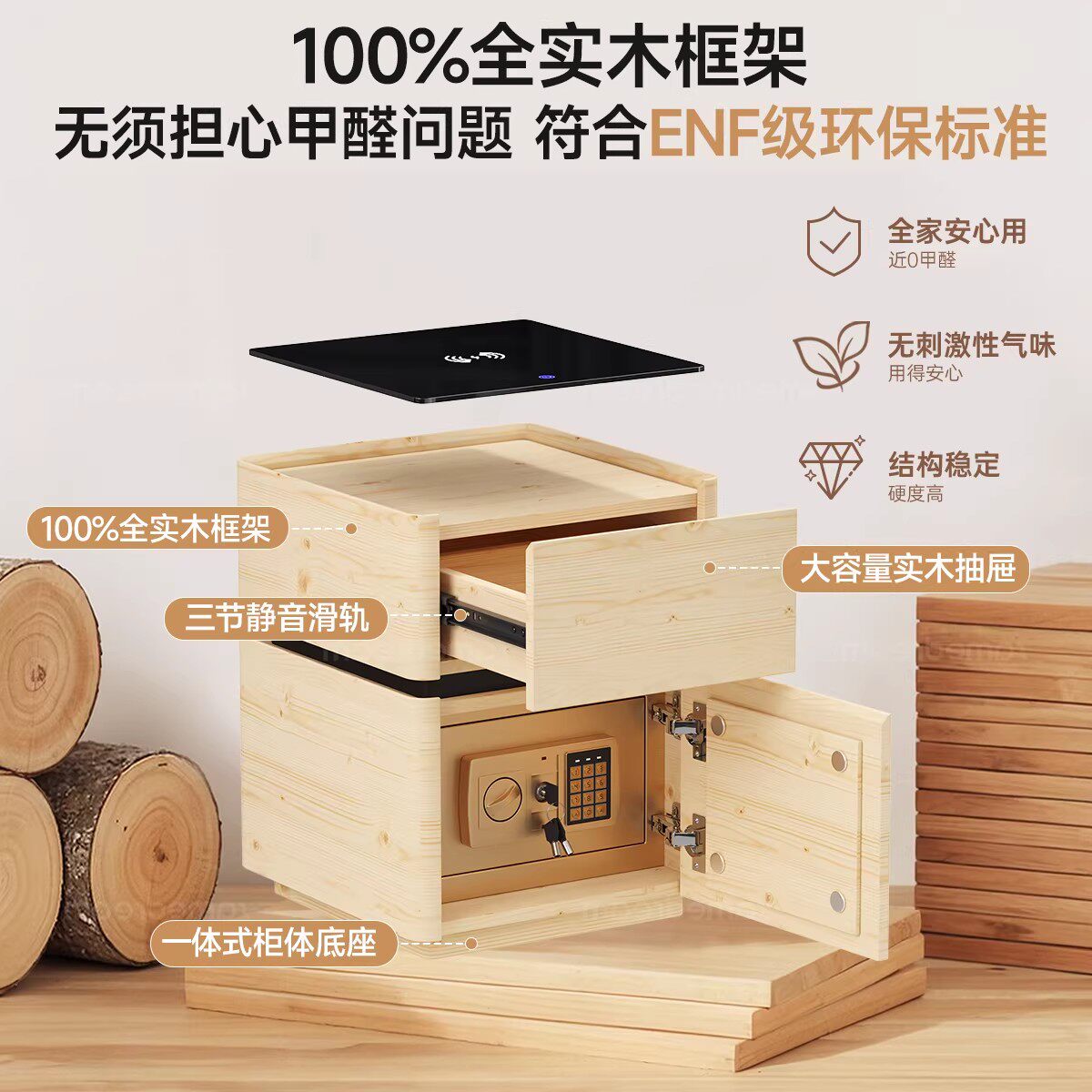 智能实木床头柜保险箱一体2026新款家用卧室轻奢高级感小型保险柜