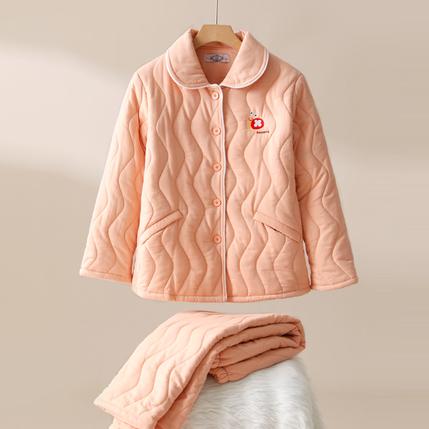美标秋冬三层加厚夹棉纯棉睡衣套装女士刺绣全棉休闲可外穿家居服