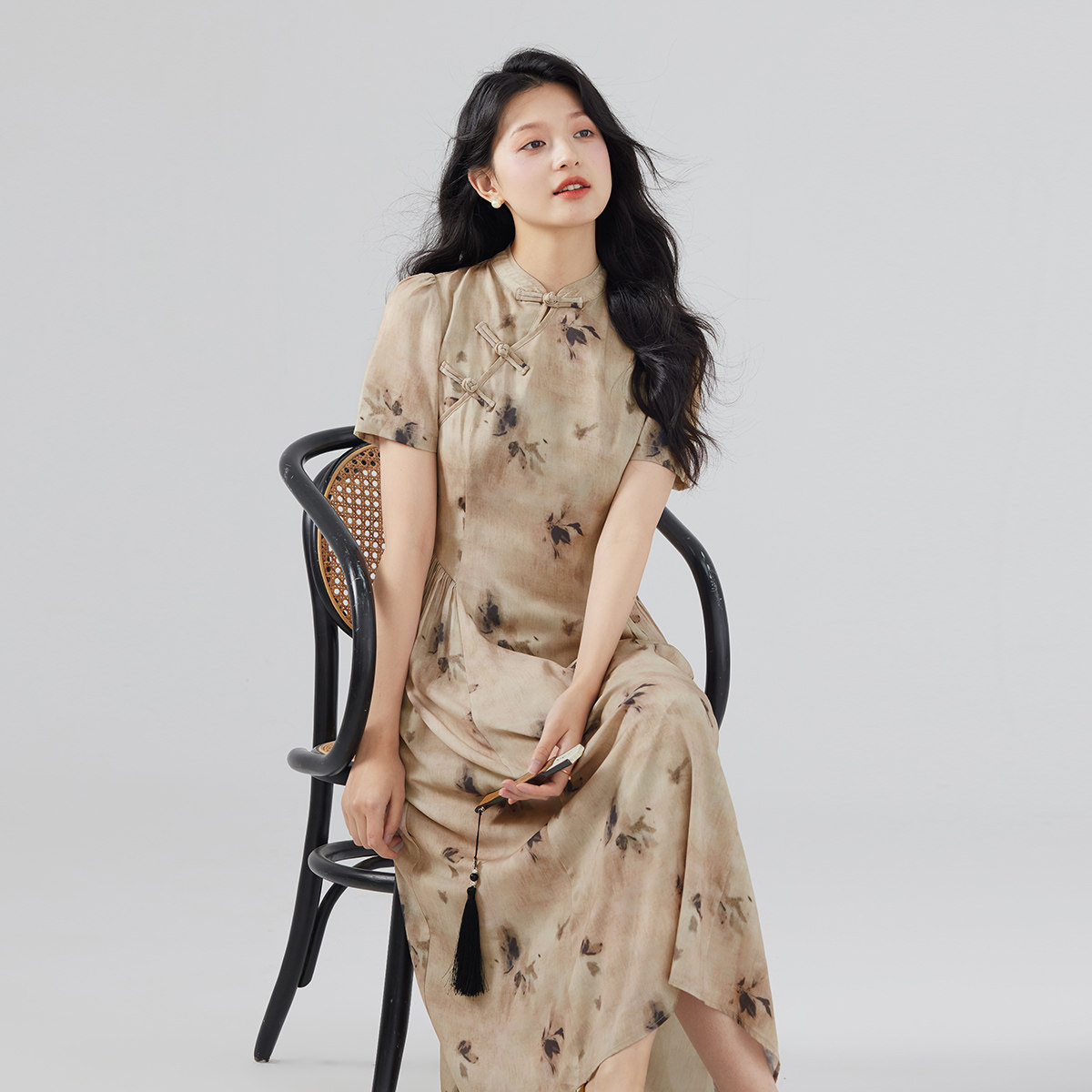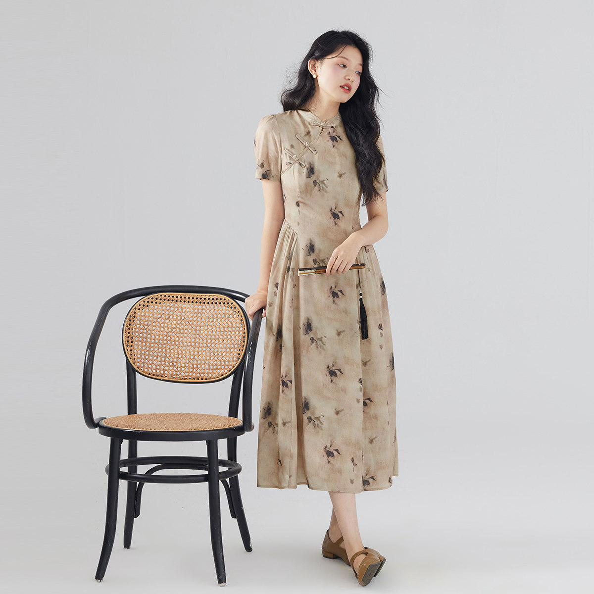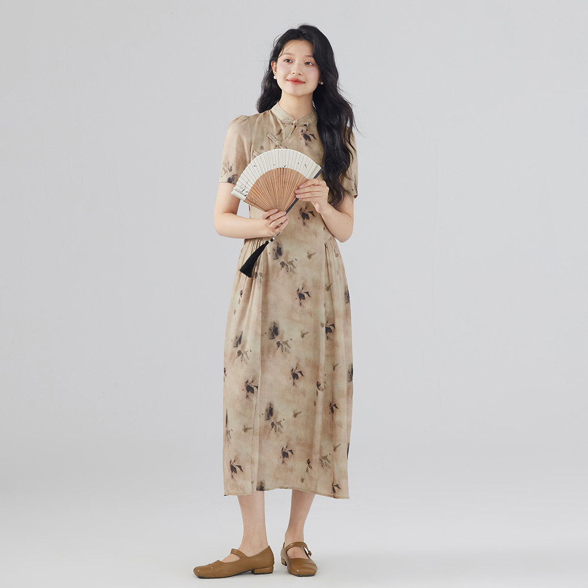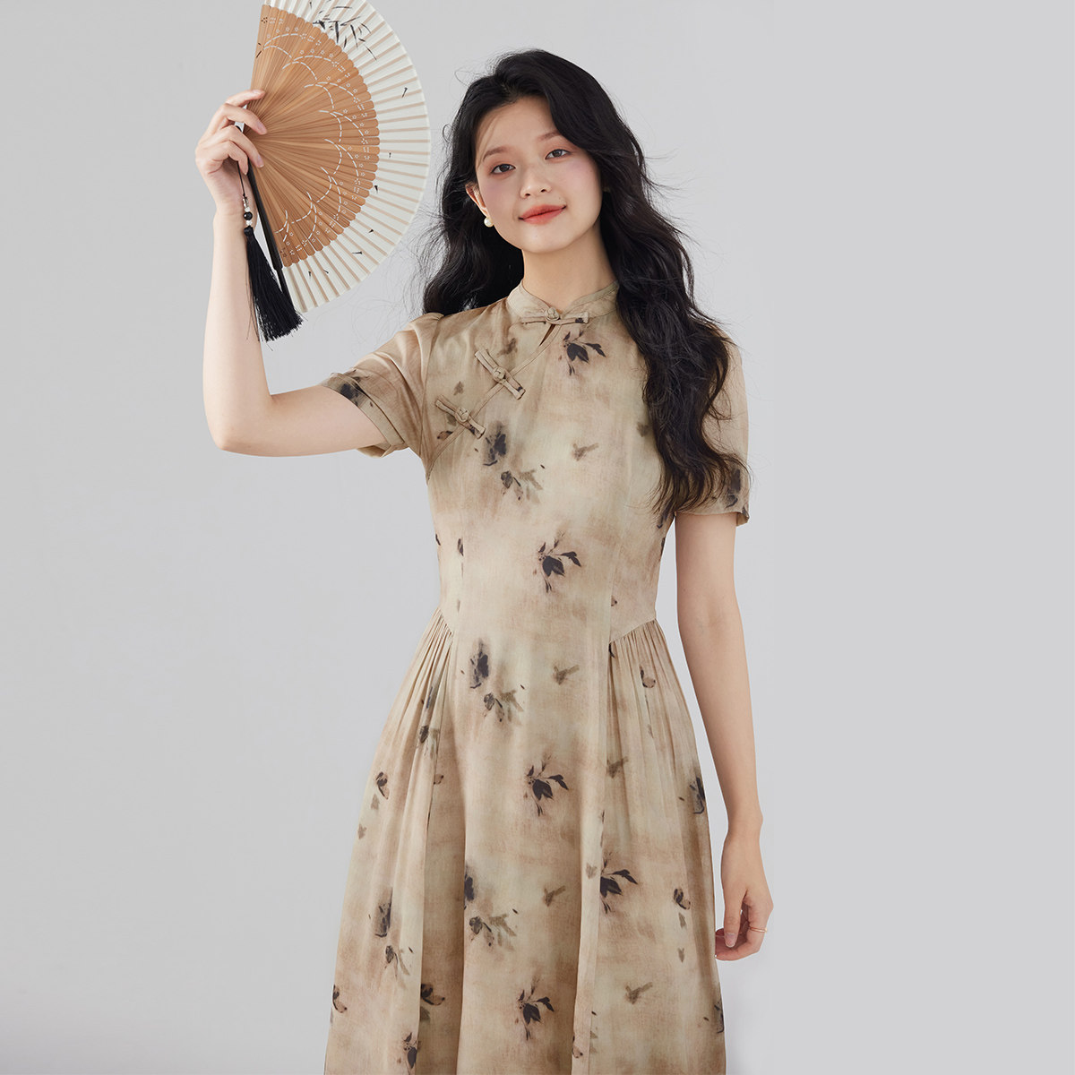 one more新中式高级感复古碎花连衣裙女2025新款气质修身印花长裙