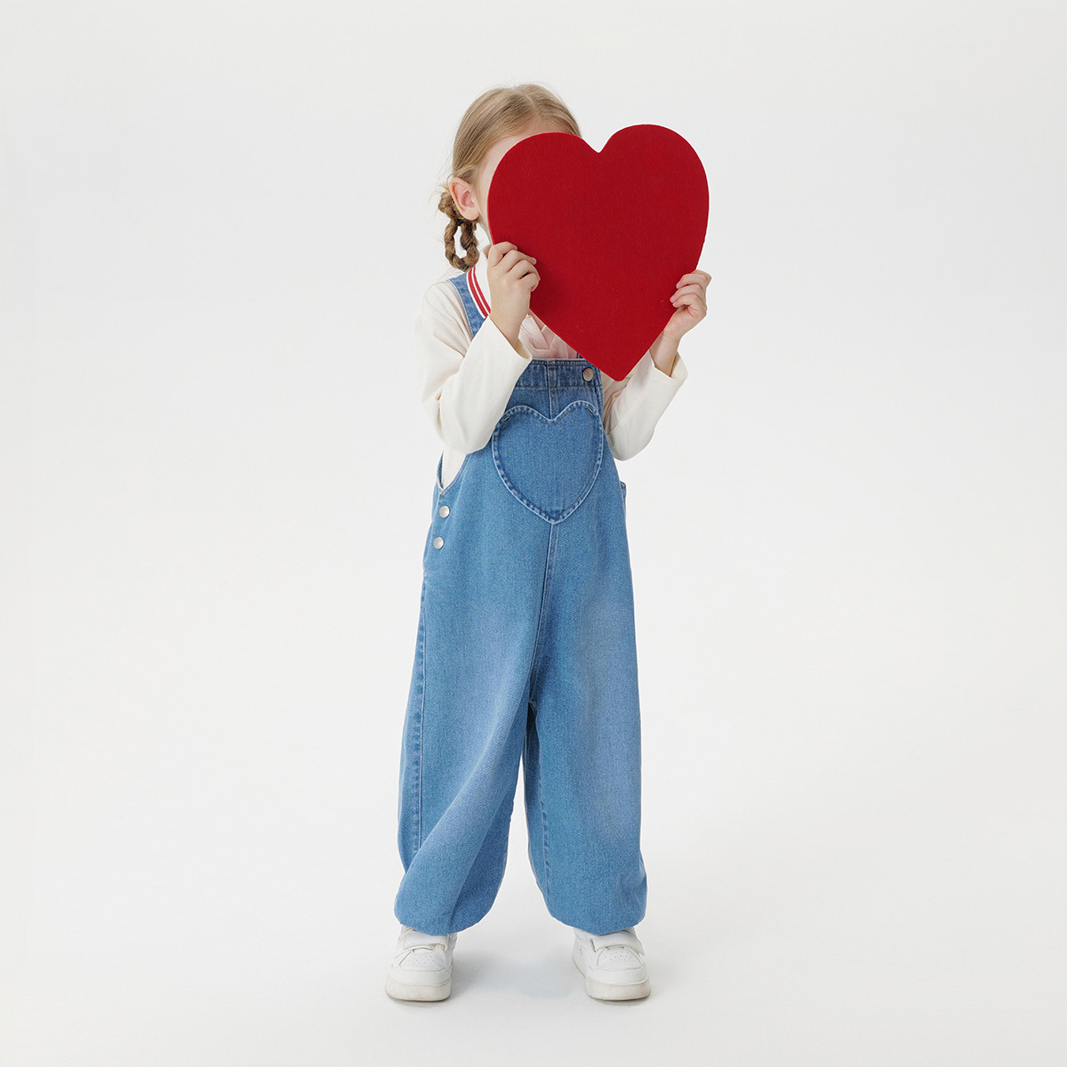 100%纯棉牛仔面料,肩带可调节,爱心大口袋