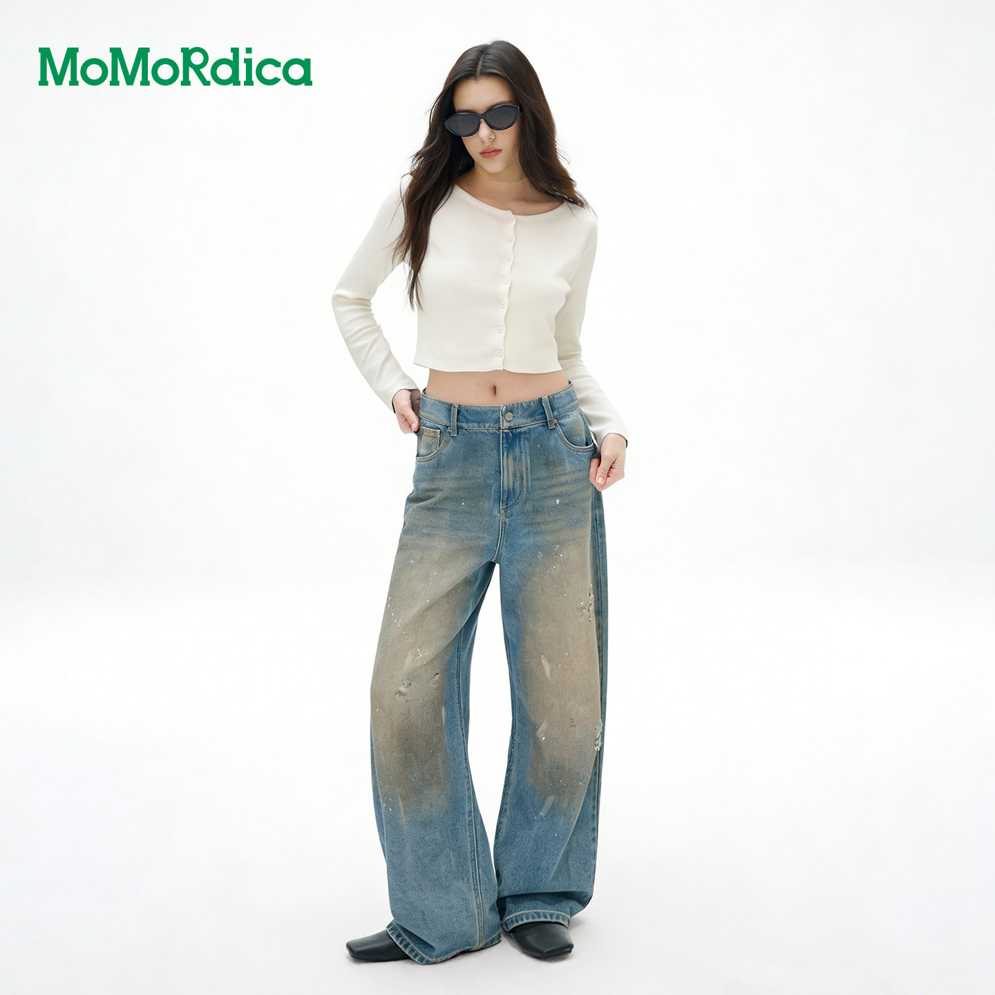 Momordica 做旧破洞牛仔裤2026年春季休闲长裤白色牛仔阔腿裤女
