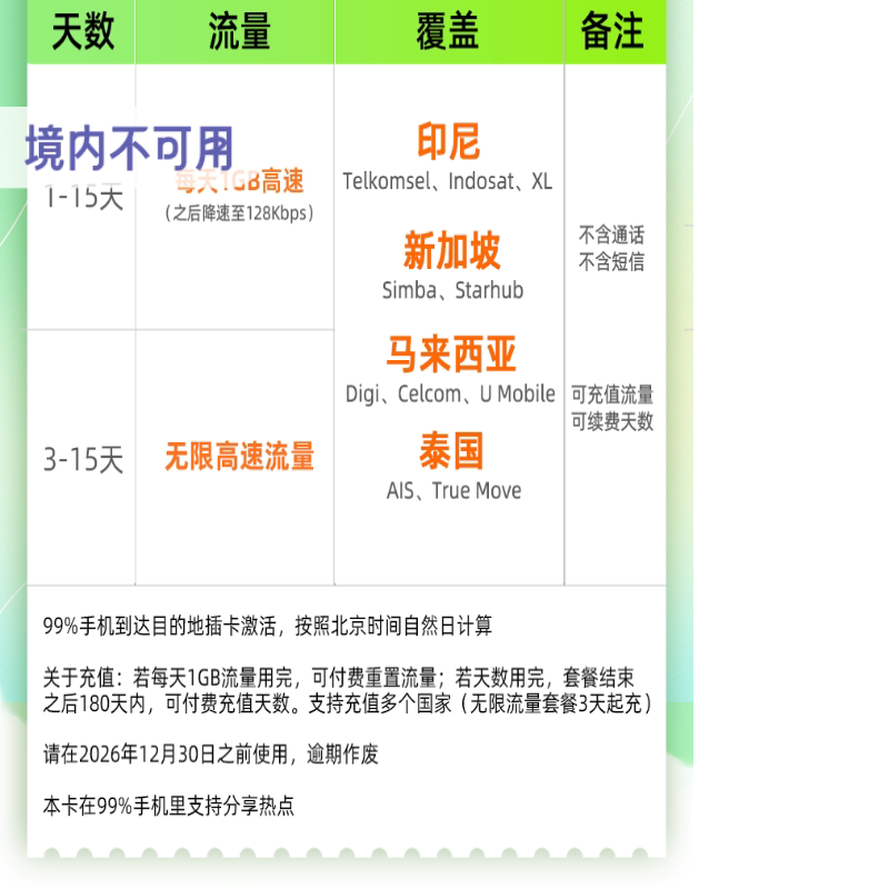 顺丰包邮+赠送转换插头!到达印尼当地插卡就能用,可选无限流量套餐! 印尼巴厘岛TELKOMSEL运营商网络,支持热点! 印尼、新加坡、马来西亚、泰国四国旅游可一卡通用! 纯流量卡,支持充值续费,无通话短信功能!