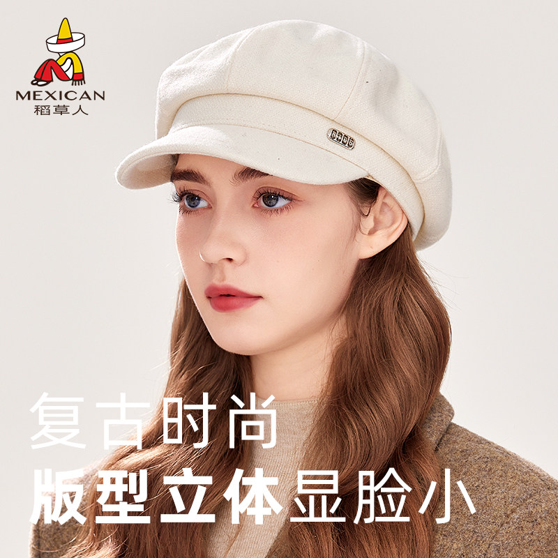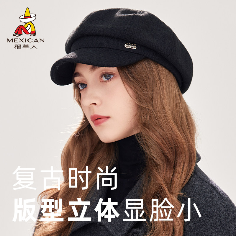 稻草人2025秋冬季新款贝雷帽女显脸小八角帽红色复古报童画家帽子