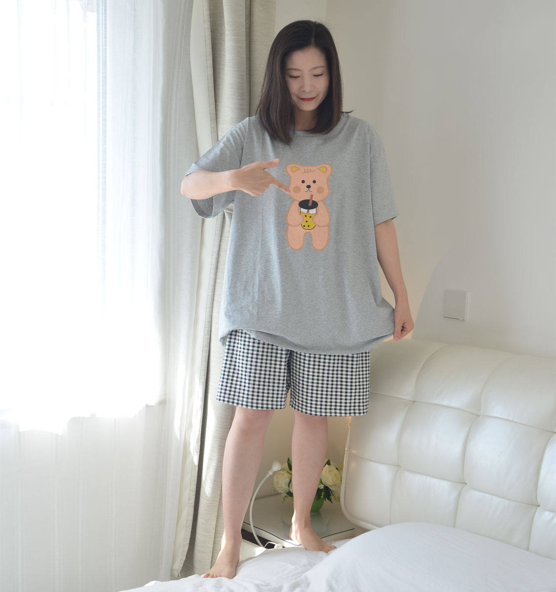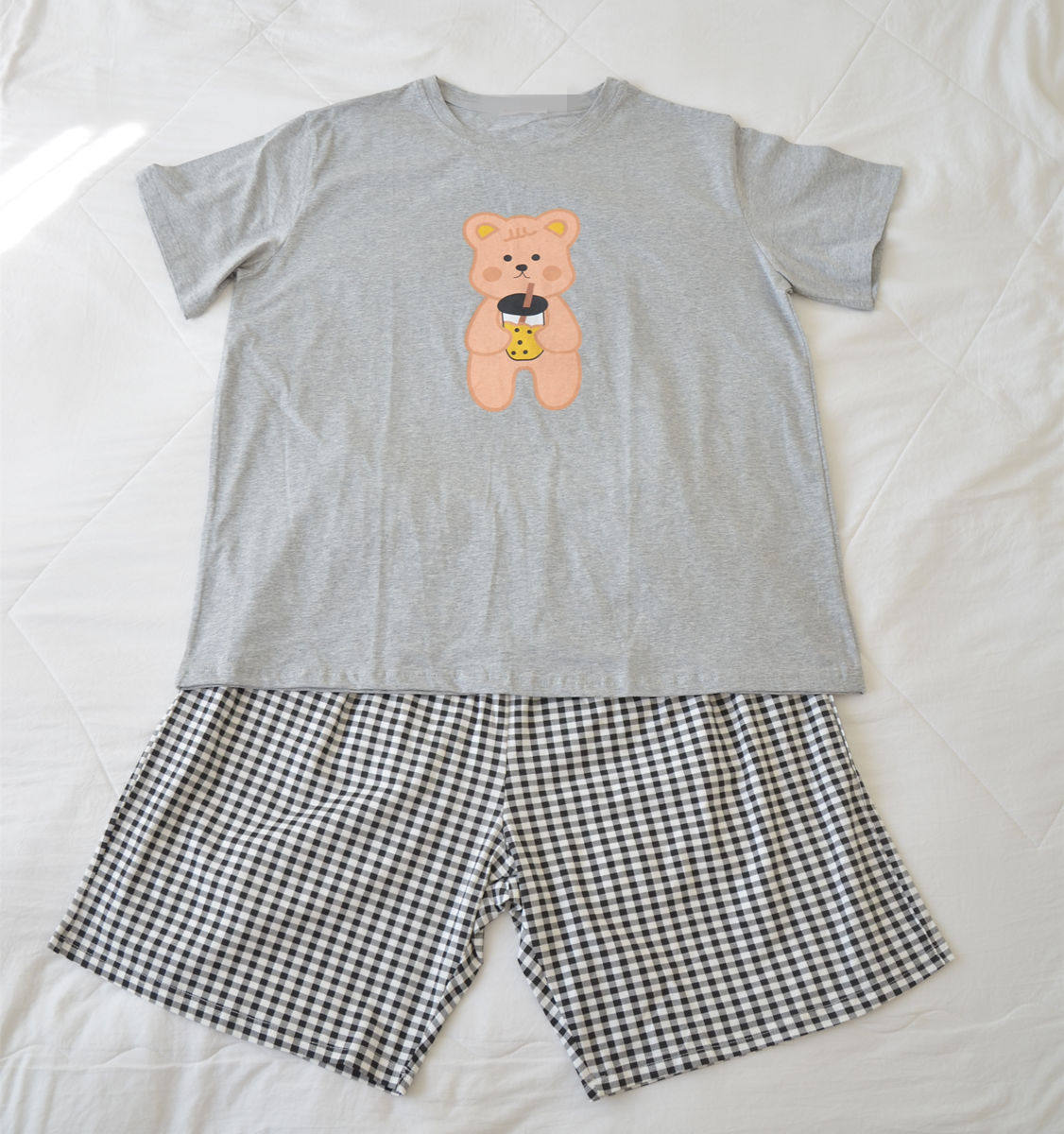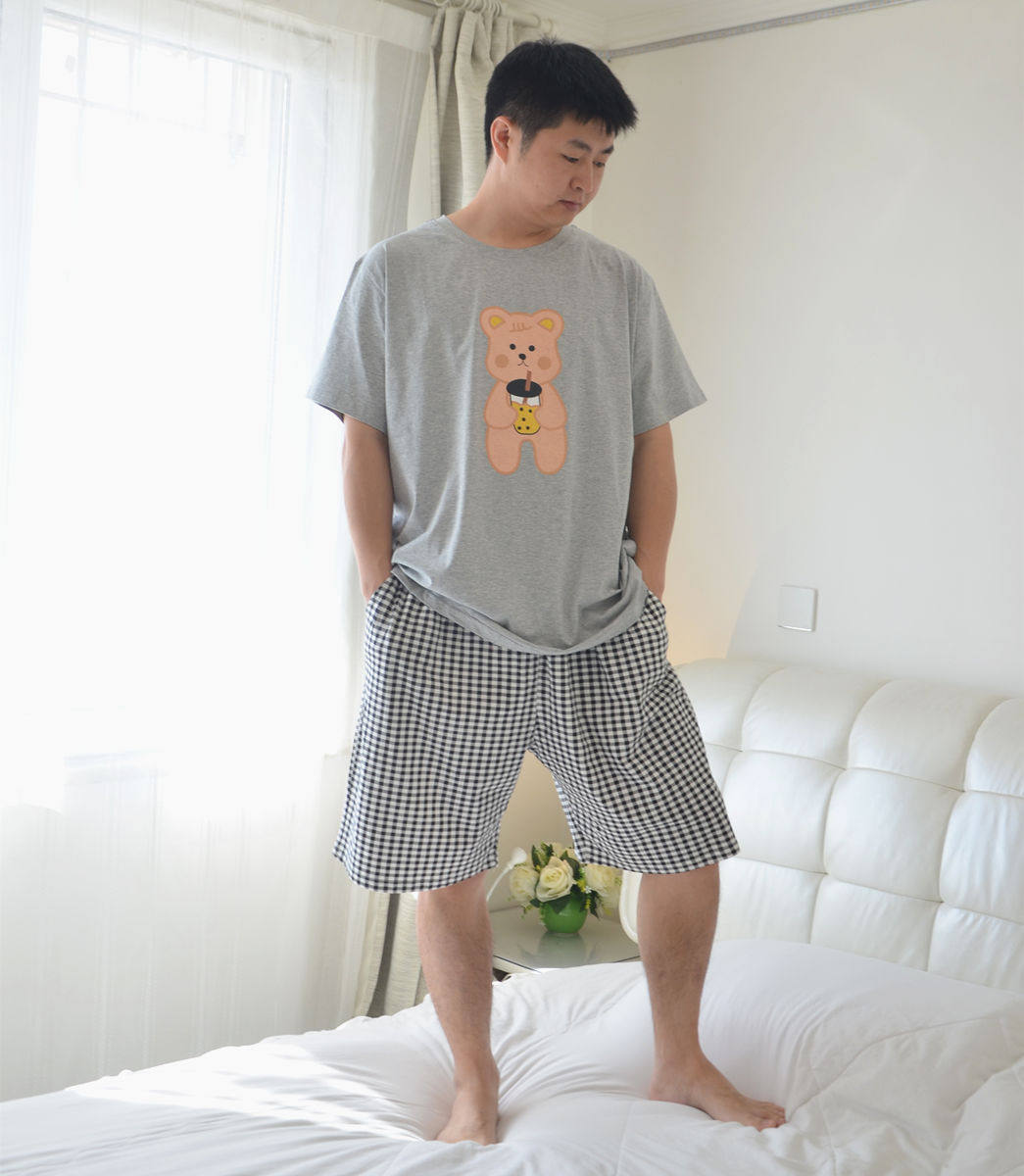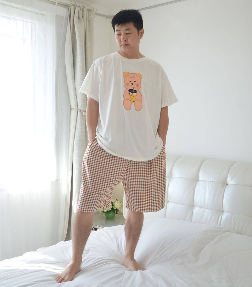 加肥大码奶茶熊情侣睡衣男女夏季纯棉圆领短袖短裤家居服套装胖MM