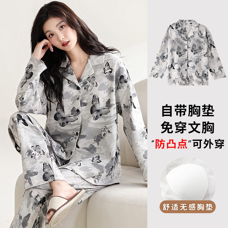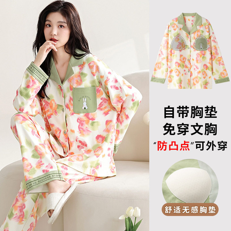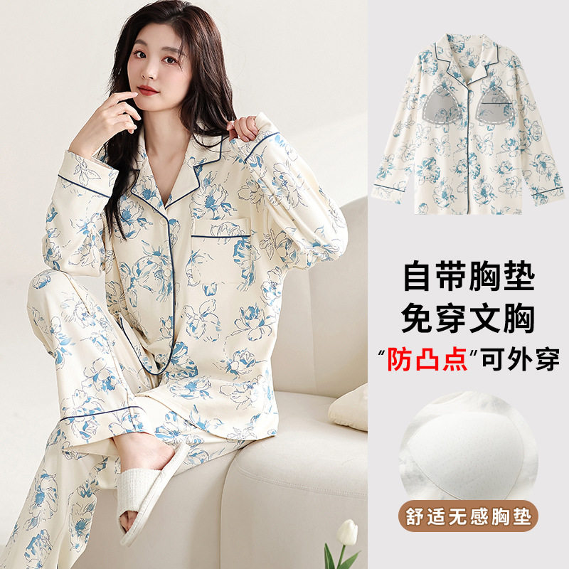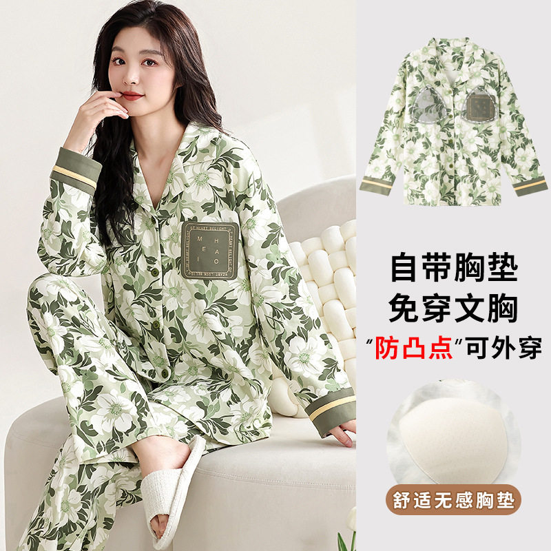 带胸垫睡衣女士春秋款纯棉长袖大码甜美舒适花卉可外穿家居服套装