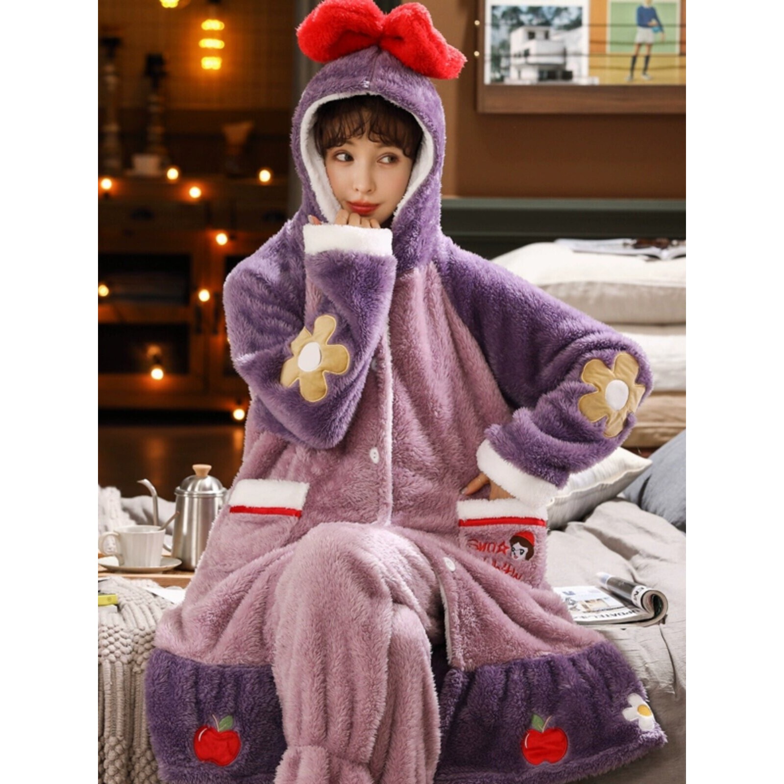 红豆珊瑚绒睡衣女秋冬加厚加绒法兰绒睡袍毛绒家居服套装红色兔子