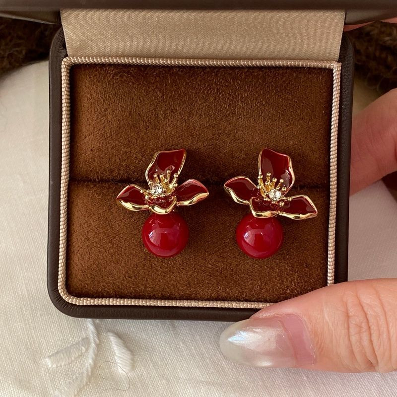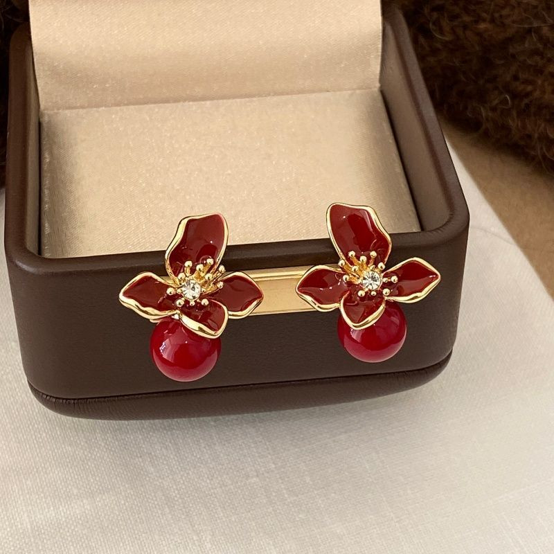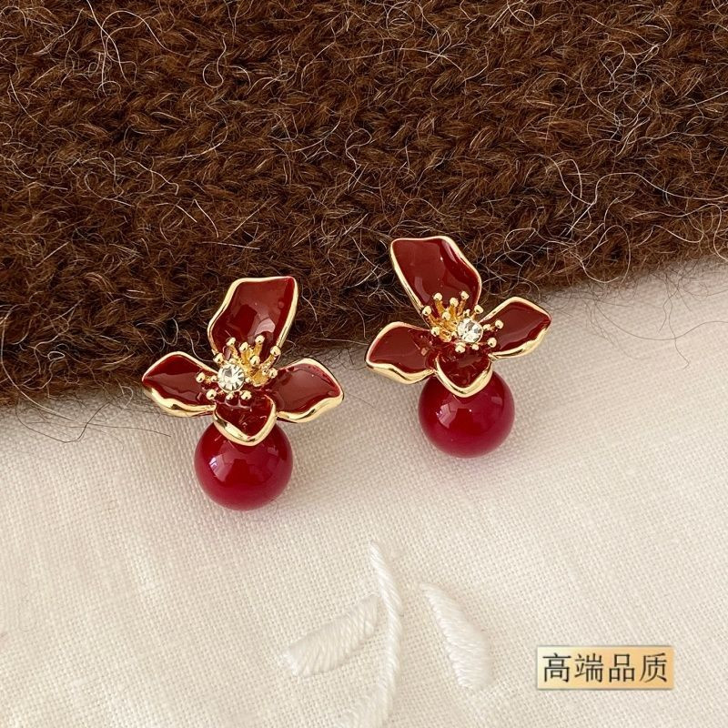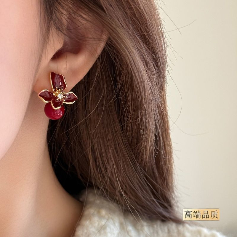 红色滴釉花朵耳环气质高级感轻奢2026新款爆款