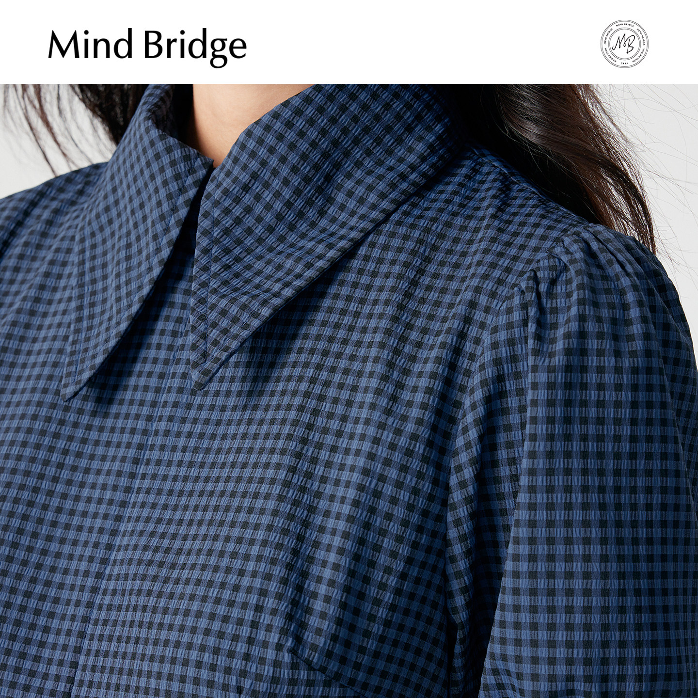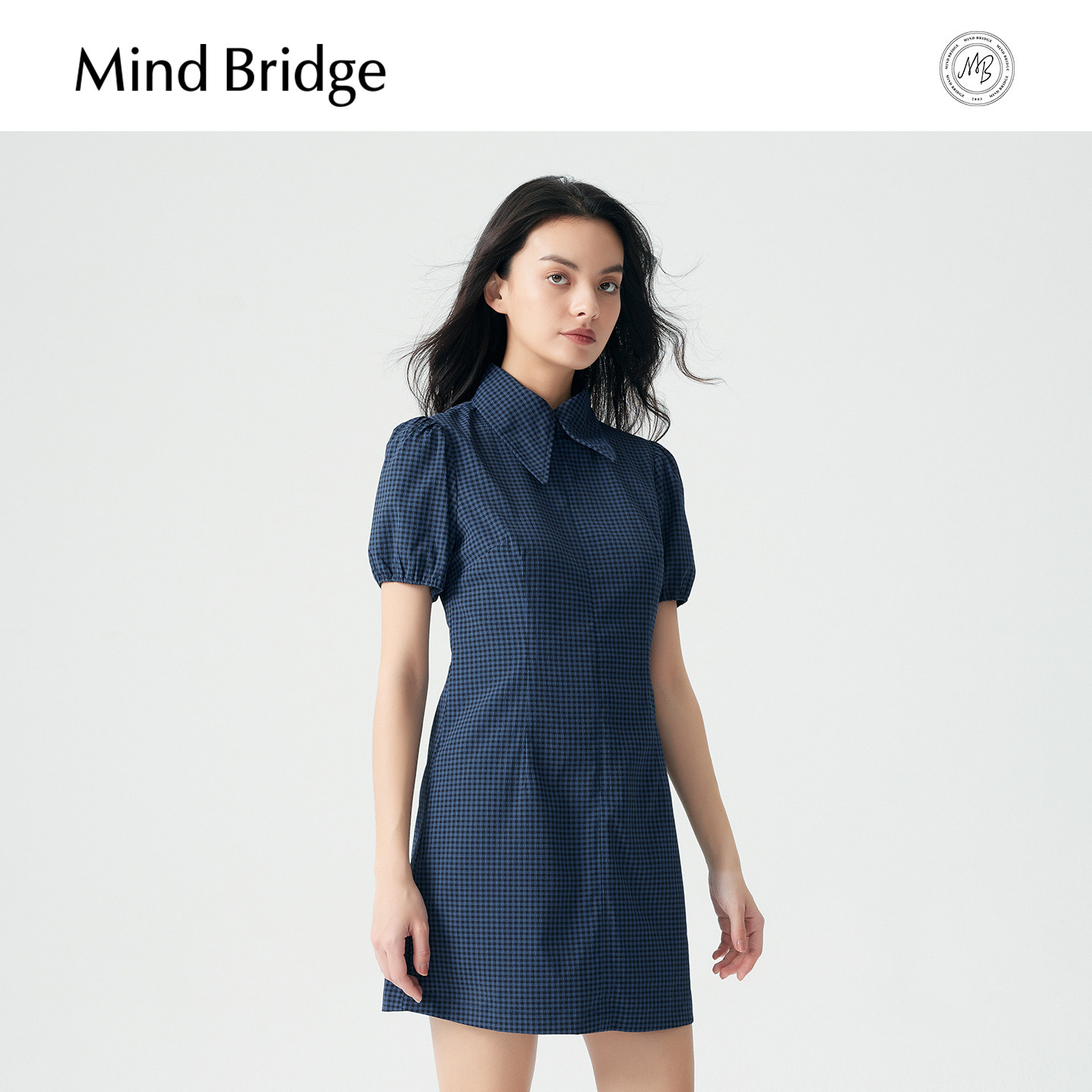 MB MindBridge百家好夏季格子泡泡袖工装裙女短袖连衣裙