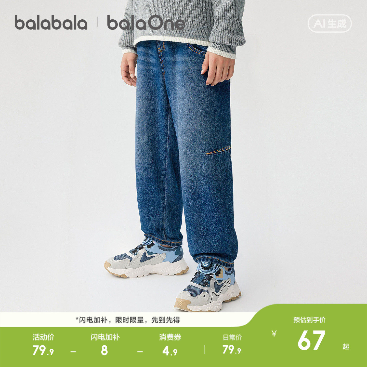 巴拉巴拉男童牛仔裤中大童宝宝加绒裤子冬季新款童装儿童直筒裤潮