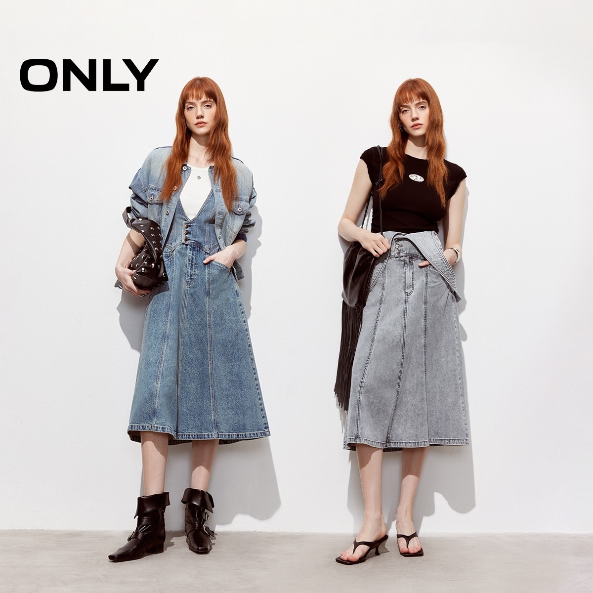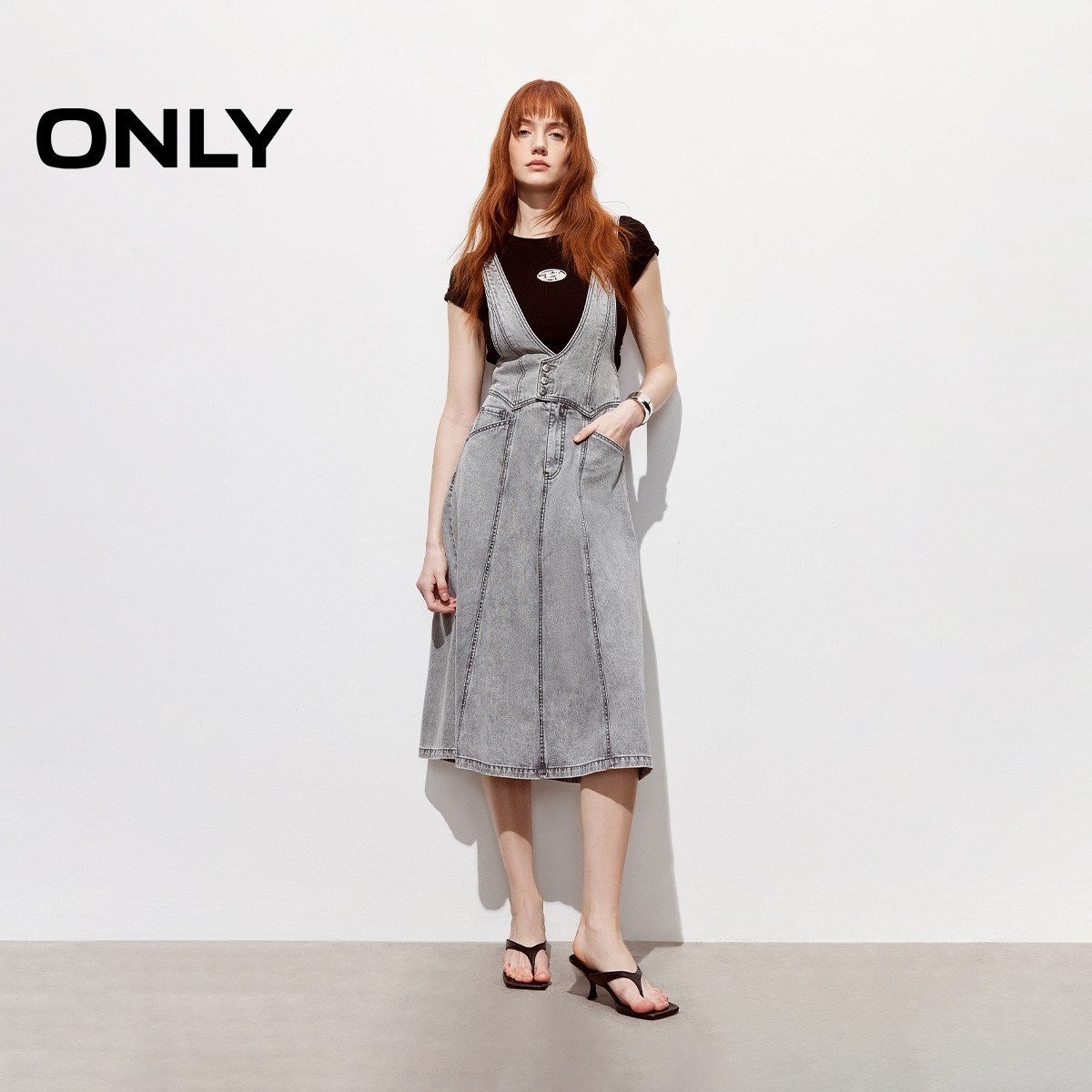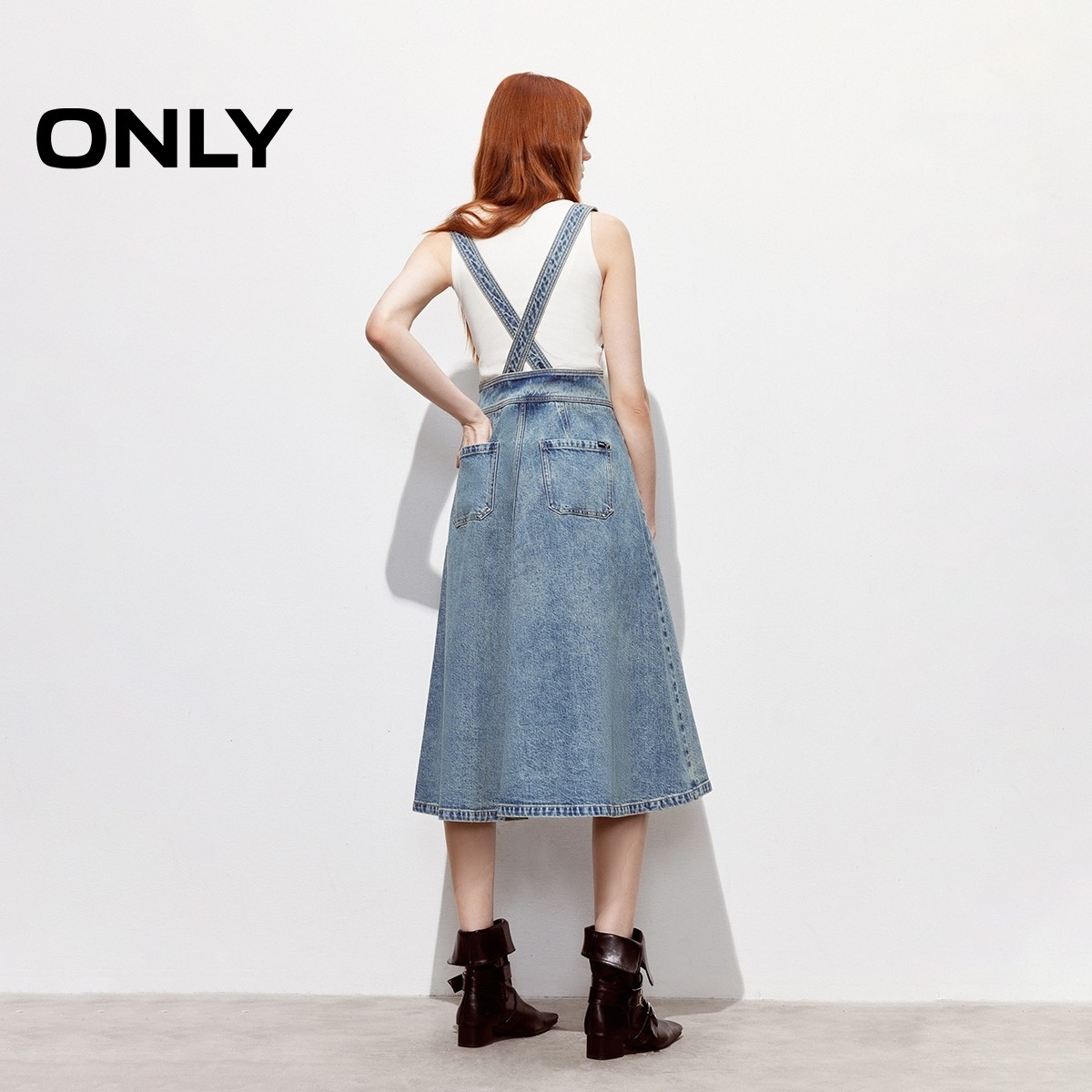 ONLY2026春季新款含莱赛尔收腰裙子可调节肩带伞裙背带牛仔连衣裙
