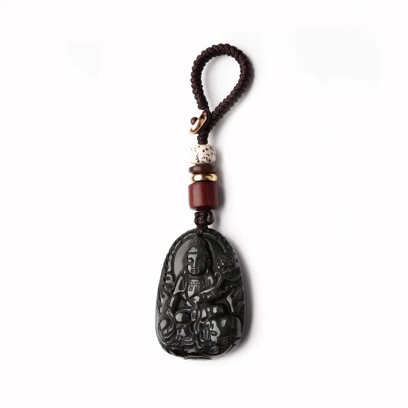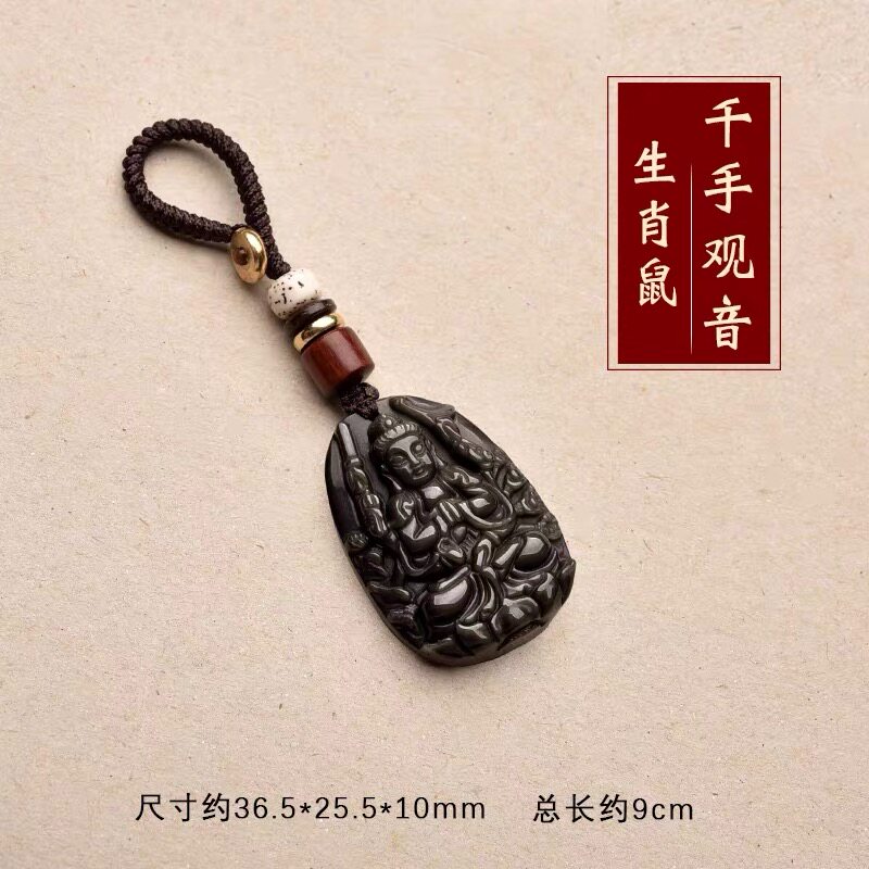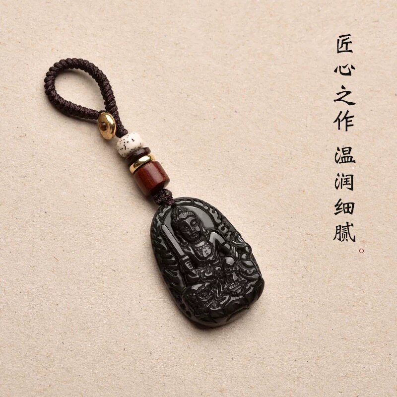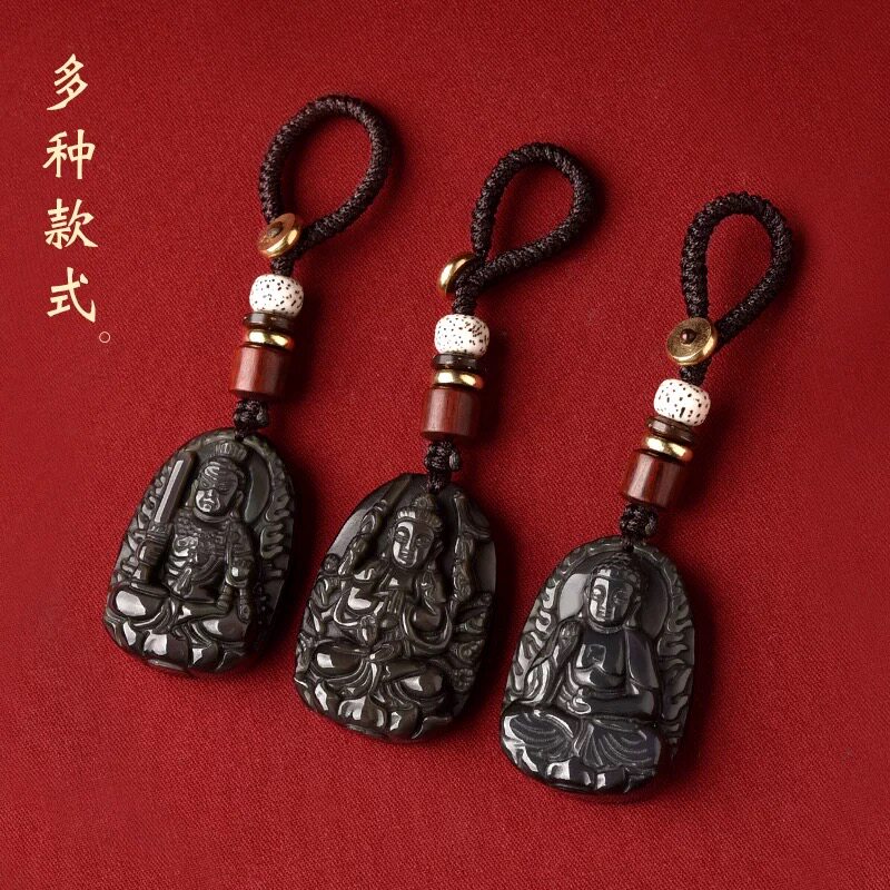 天然黑曜石文殊菩萨吊坠生肖兔本命佛男女项链钥匙扣挂件护身符