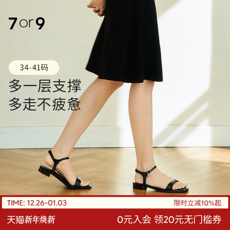 7or9凉鞋女鞋平底鞋夏季一字带羊皮软底舒适露趾通勤单鞋黑色布丁