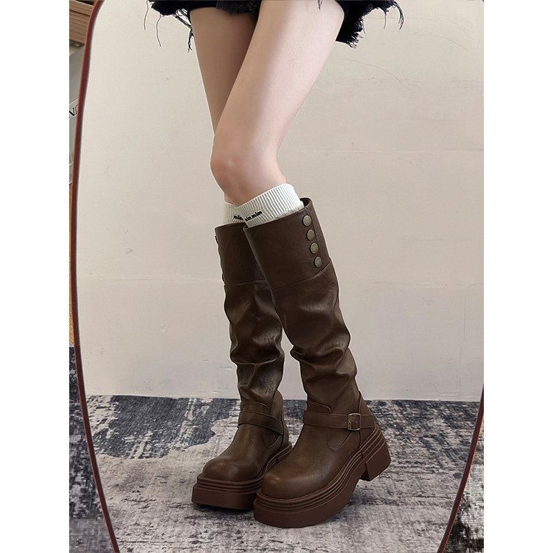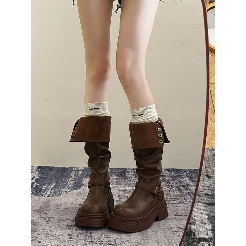 棕色英伦风粗跟厚底长筒靴女2025新款秋冬季显瘦长靴骑士靴子高筒