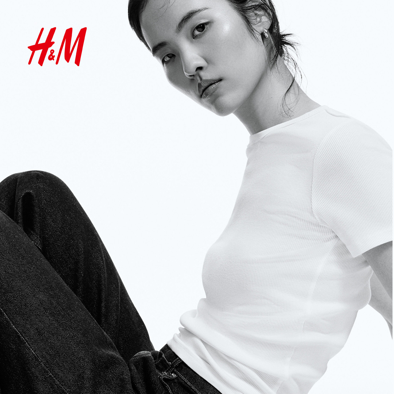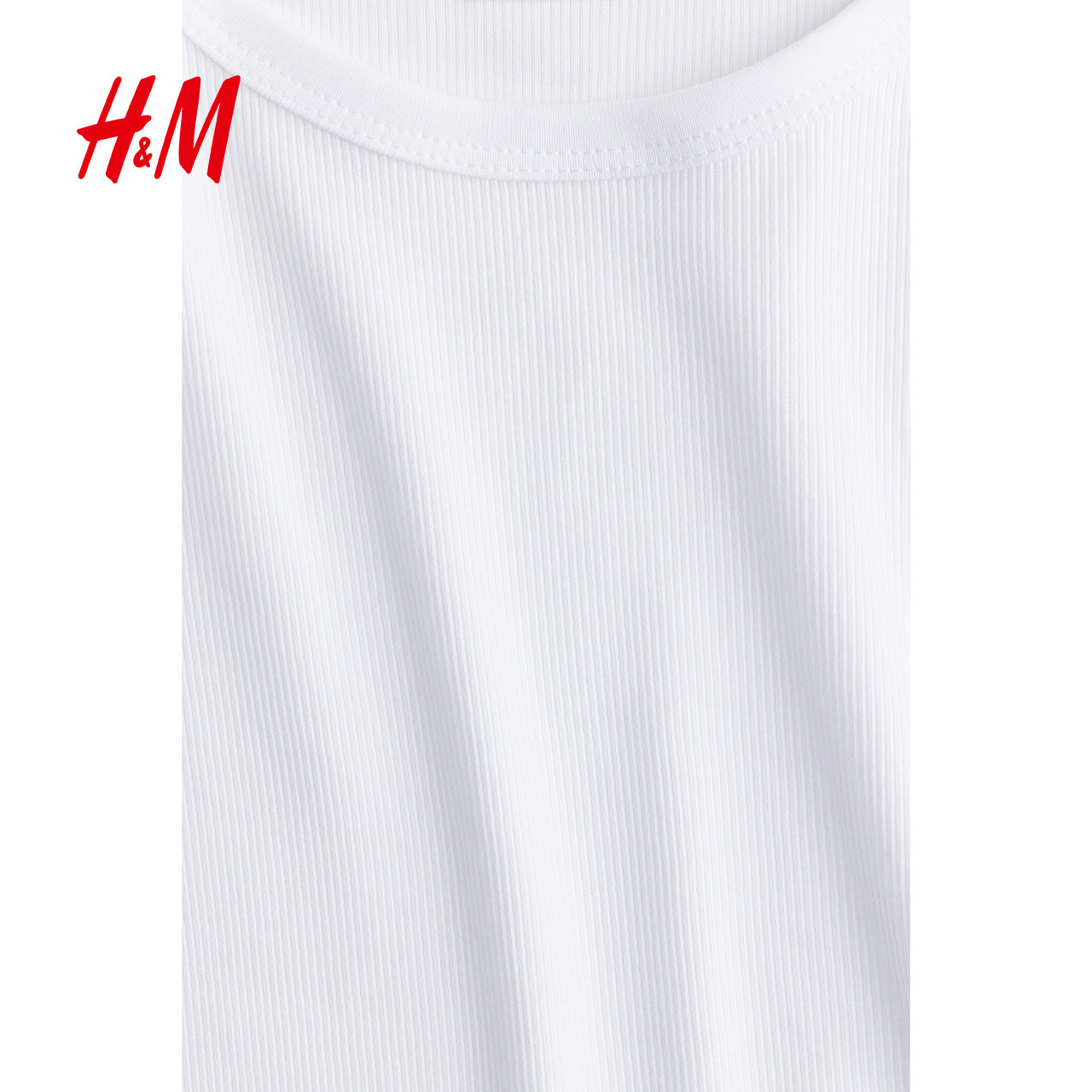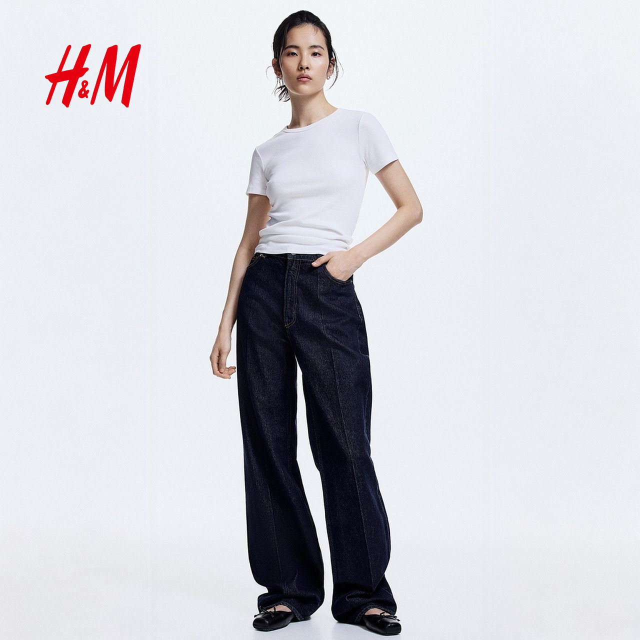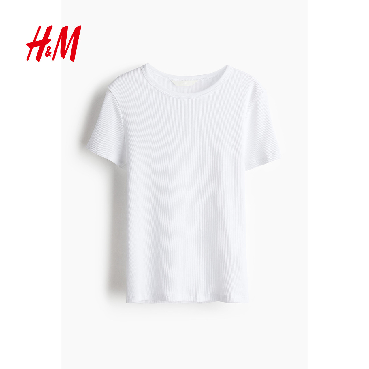 HM女装T恤2025冬季新款时尚修身短袖窄边领口直筒下摆上衣1260556