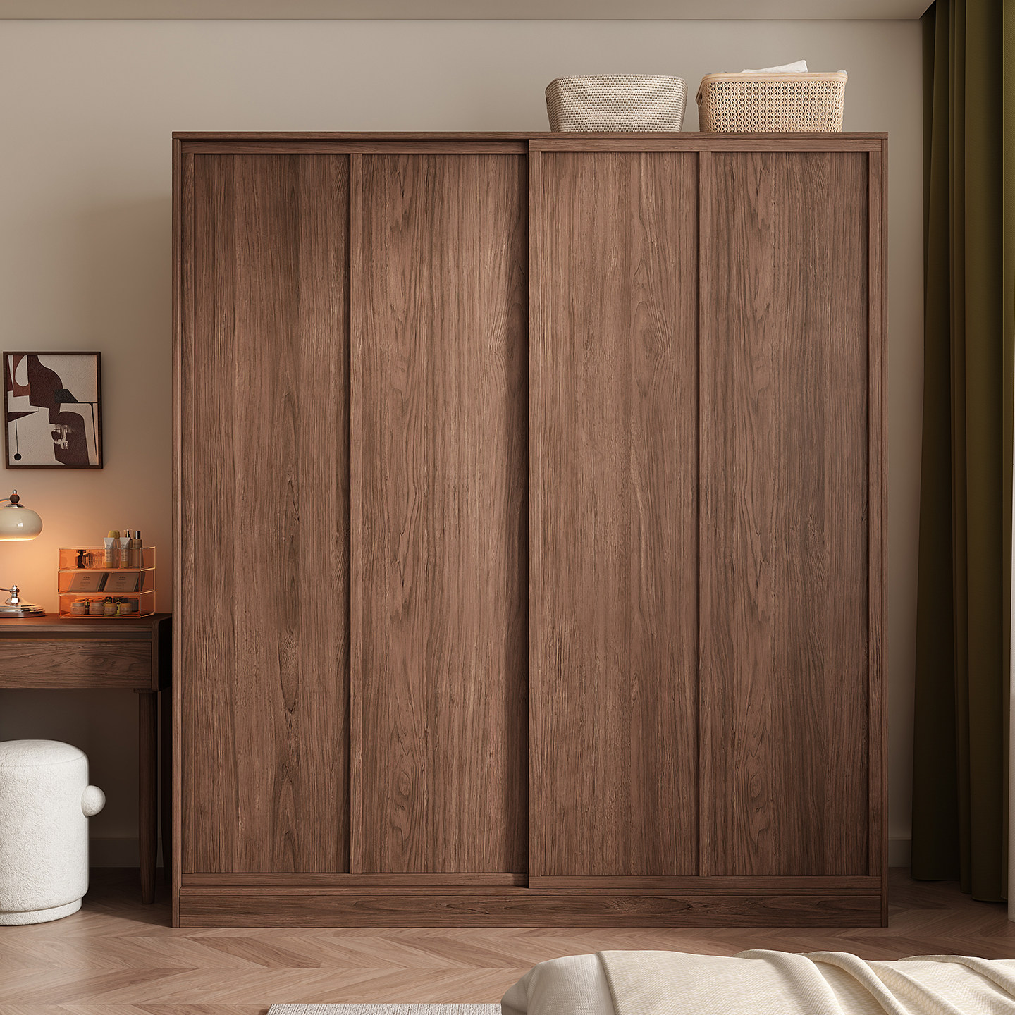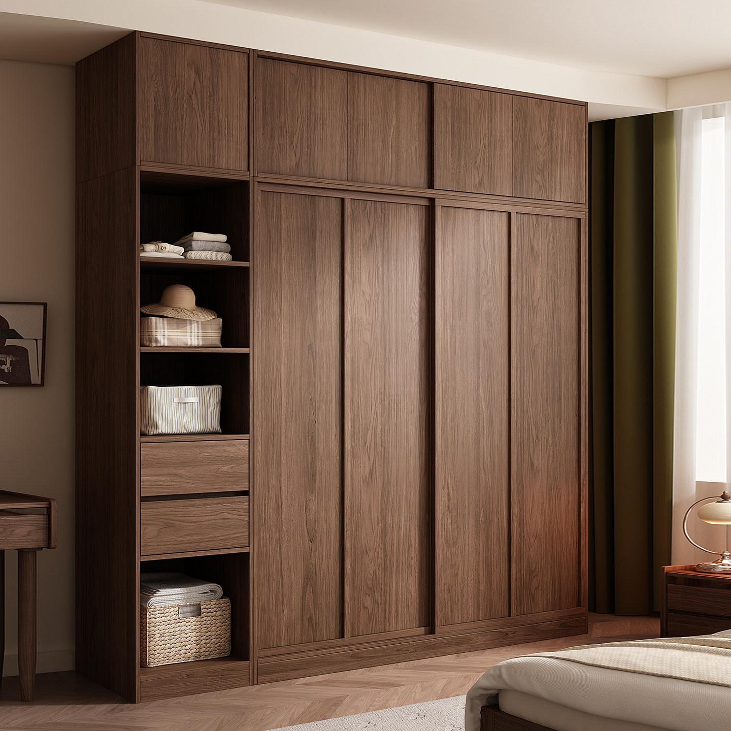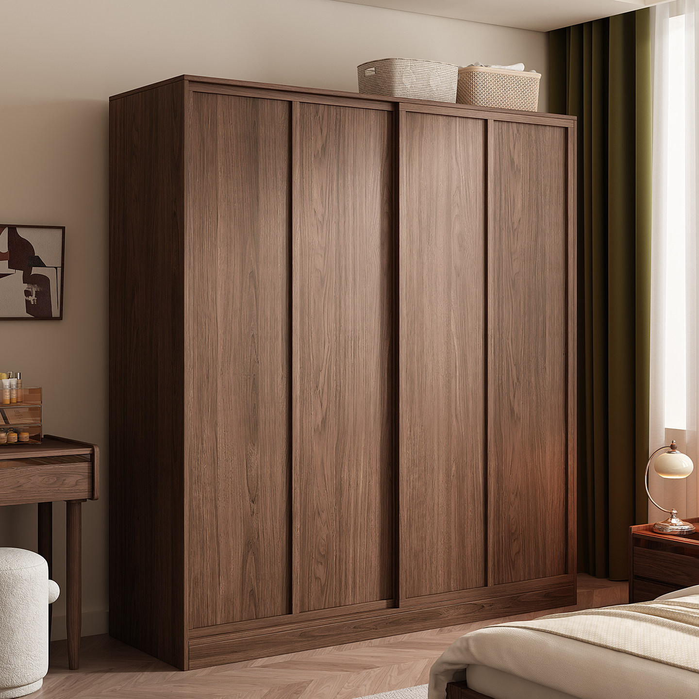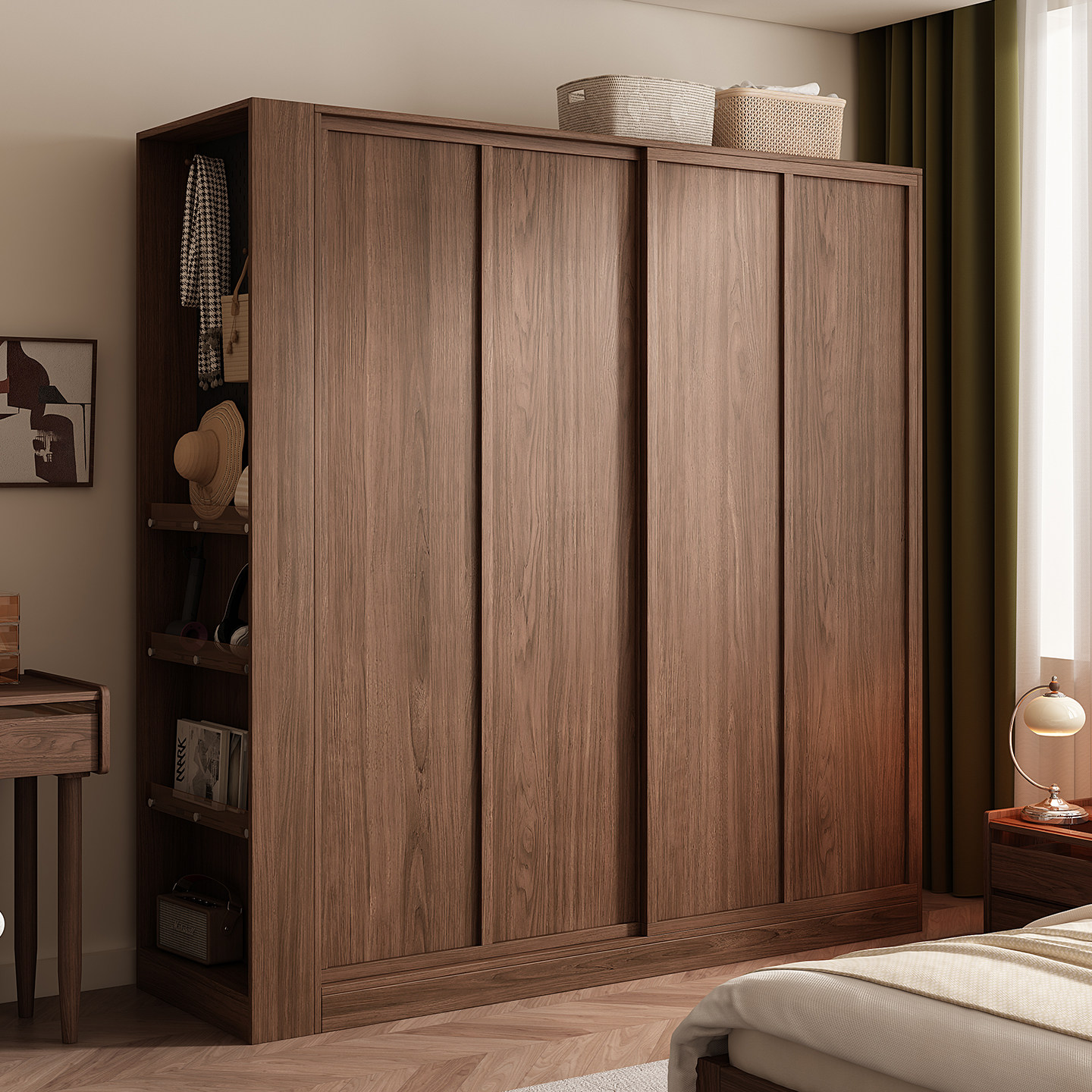 木兜家具袋鼠衣柜黑胡桃色中古风复古推拉门衣柜卧室家用实木衣橱
