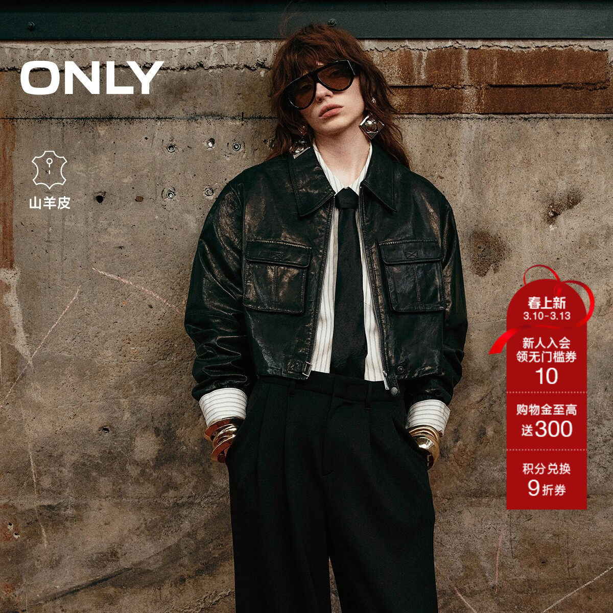 ONLY春季帅气机车风挺括落肩长袖羊皮真皮皮衣外套女