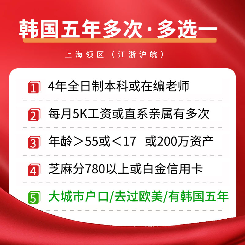 韩国签证个人旅游加急简化代办 五年十年多次签证 材料超简 可当日递交 可加急办理 多个办理条件,满足1个即可办理 可复印材料打印照片身份证快取